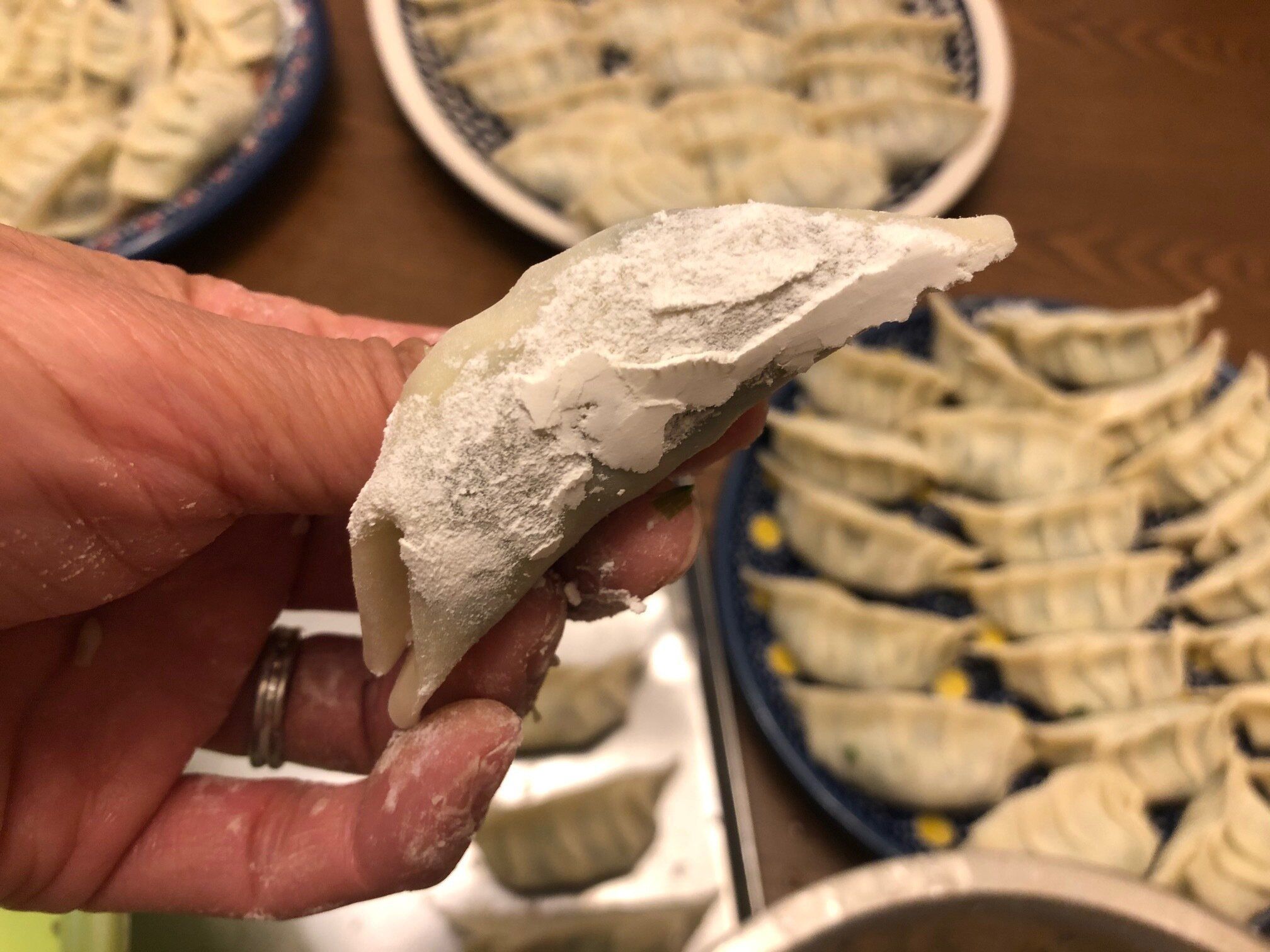 まずは、餃子を包むとき、小皿に小麦粉を入れておき、包んだ餃子の底にポンポンと付けておきましょう。食材から出た水分が底に染みてきてくっつくのを防いでくれます。片栗粉でも大丈夫ですよ。