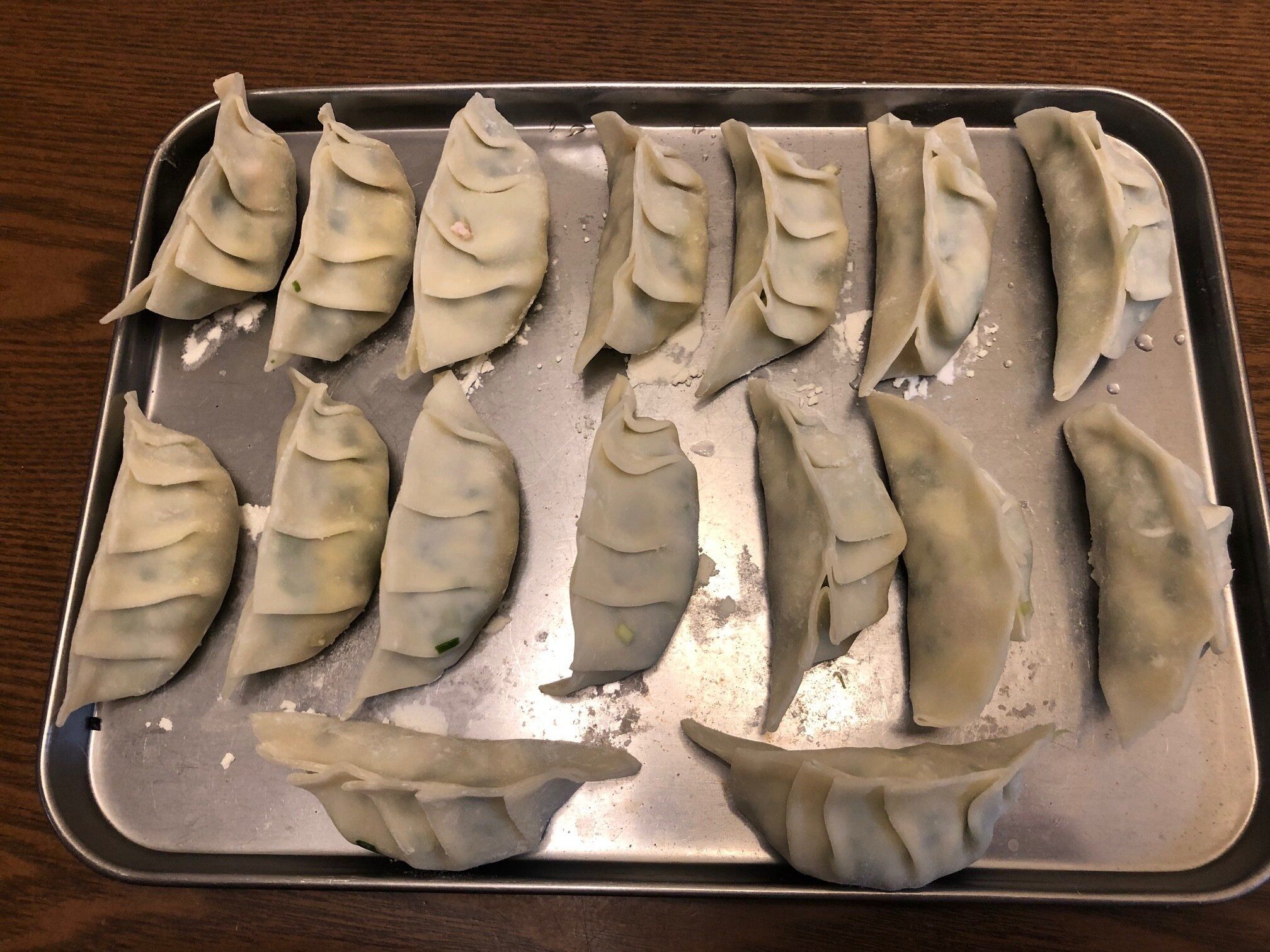 小麦粉をつけた餃子を、ステンレスやアルミなどの金属のバットに並べて置きます。プラスチックのお皿などでもいいのですが、金属の方が冷えやすいのでおすすめです。このとき、程よく間をあけて餃子がくっつかないように気を付けてくださいね。餃子を並べたらラップをかけて冷凍庫へ入れましょう。
