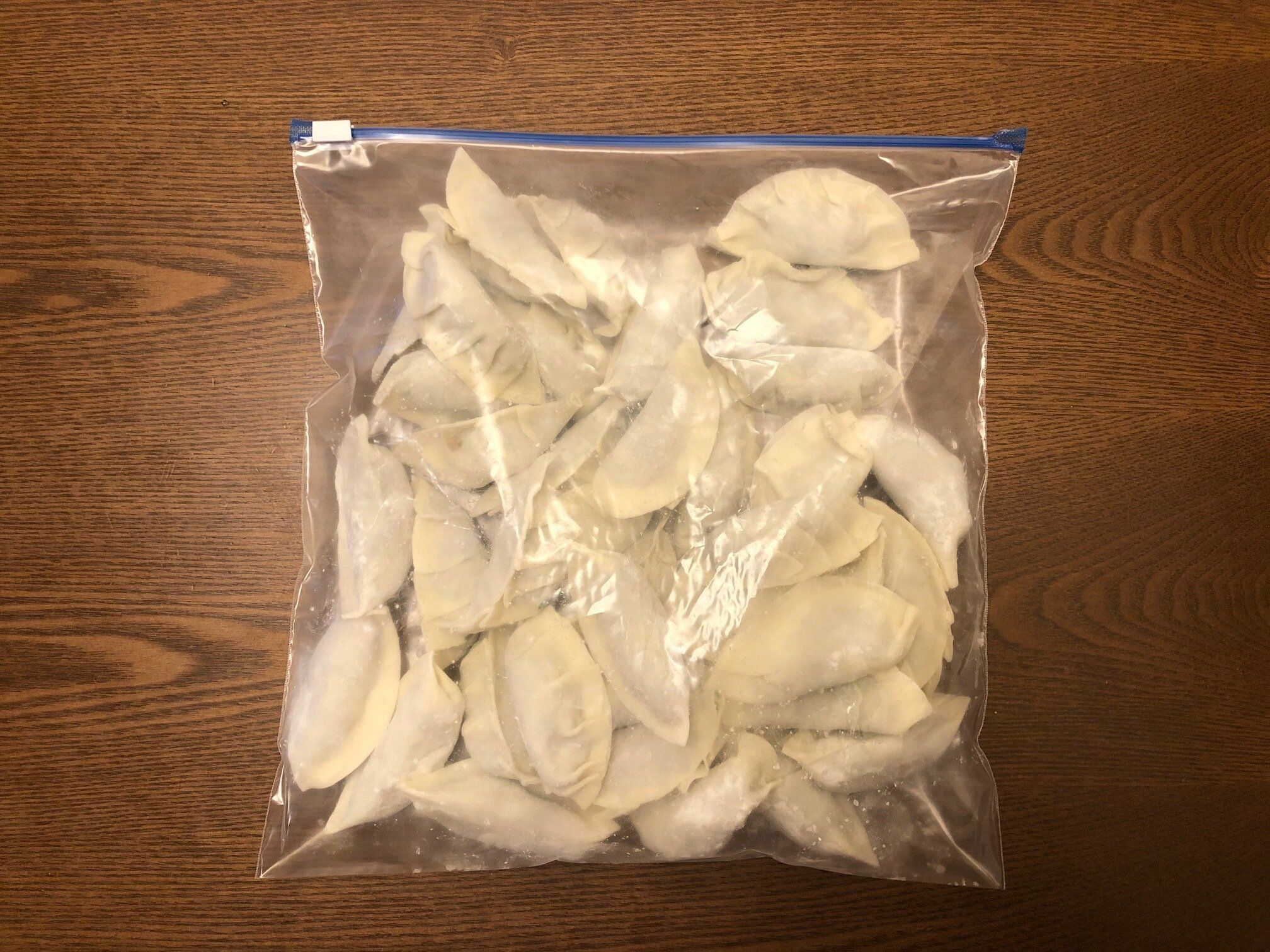 スーパーに売っている大容量の冷凍餃子のように、家でもバラバラに冷凍したいなと思いやってみた方法です。薄い保存容器へ並べて入れていたこともありましたが、普段は使わない形の容器だったり、冷凍庫で場所を取るのが悩みでした。色々試した結果、ジッパー付き袋でのバラ冷凍が一番使い勝手がいいなと思っています。