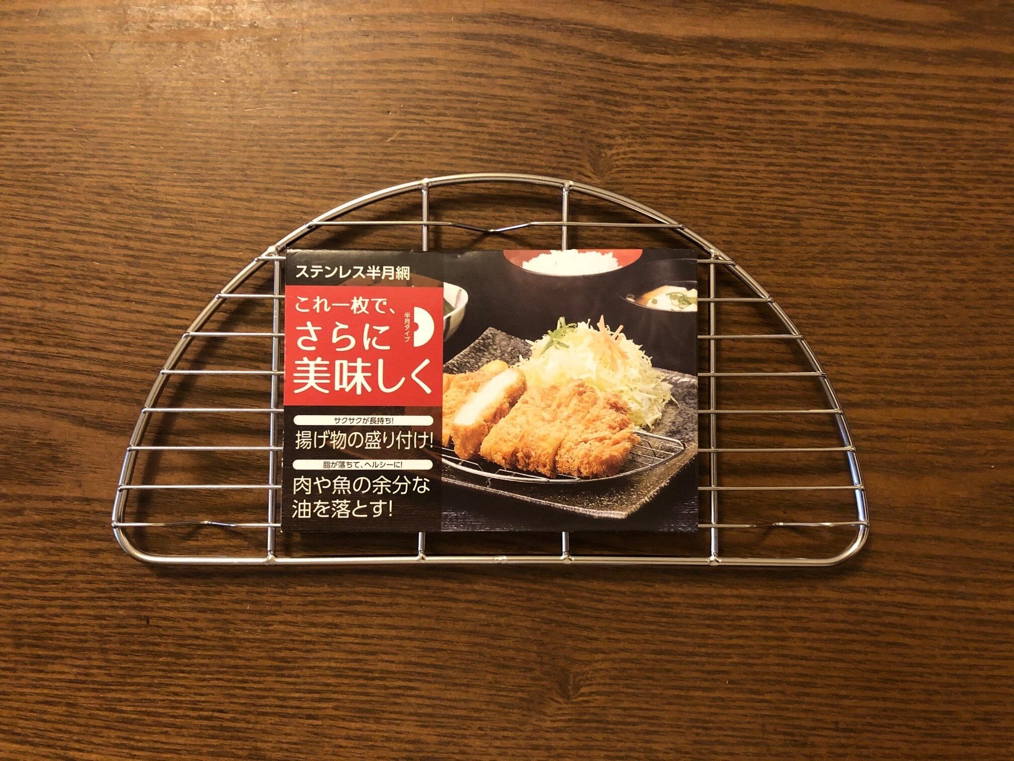 揚げ物をのせる半月網。あってもなくてもいいような物かも知れませんが、あると格段に見た目やクオリティがUPします。もうちょっとサクサクが続いたらな~なんていうちょっとしたストレスも解消!揚げものを揚げ油から出したら直接お皿に盛り付けることもできますね。100円ショップで買えるなら、買って損はないおすすめアイテムだと思います。