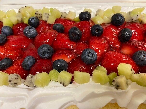 それだけでも十分豪華なケーキですが、この日は息子のお誕生日用に購入したのでさらに華やかにしたいと思い、キウイとブルーベリーで彩りをプラス。