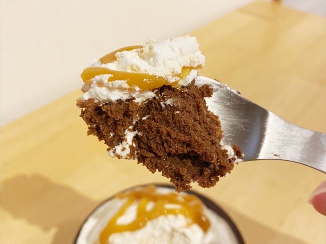 ショコラ生地にキャラメルクリームとホイップクリームをたっぷり絞り、キャラメルソースを合わせたカップケーキ。