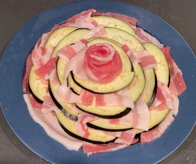 2)豚バラ肉と茄子をお皿に並べ、500wで3分前後チンします。(加熱時間は様子を見ながら調整して下さい)