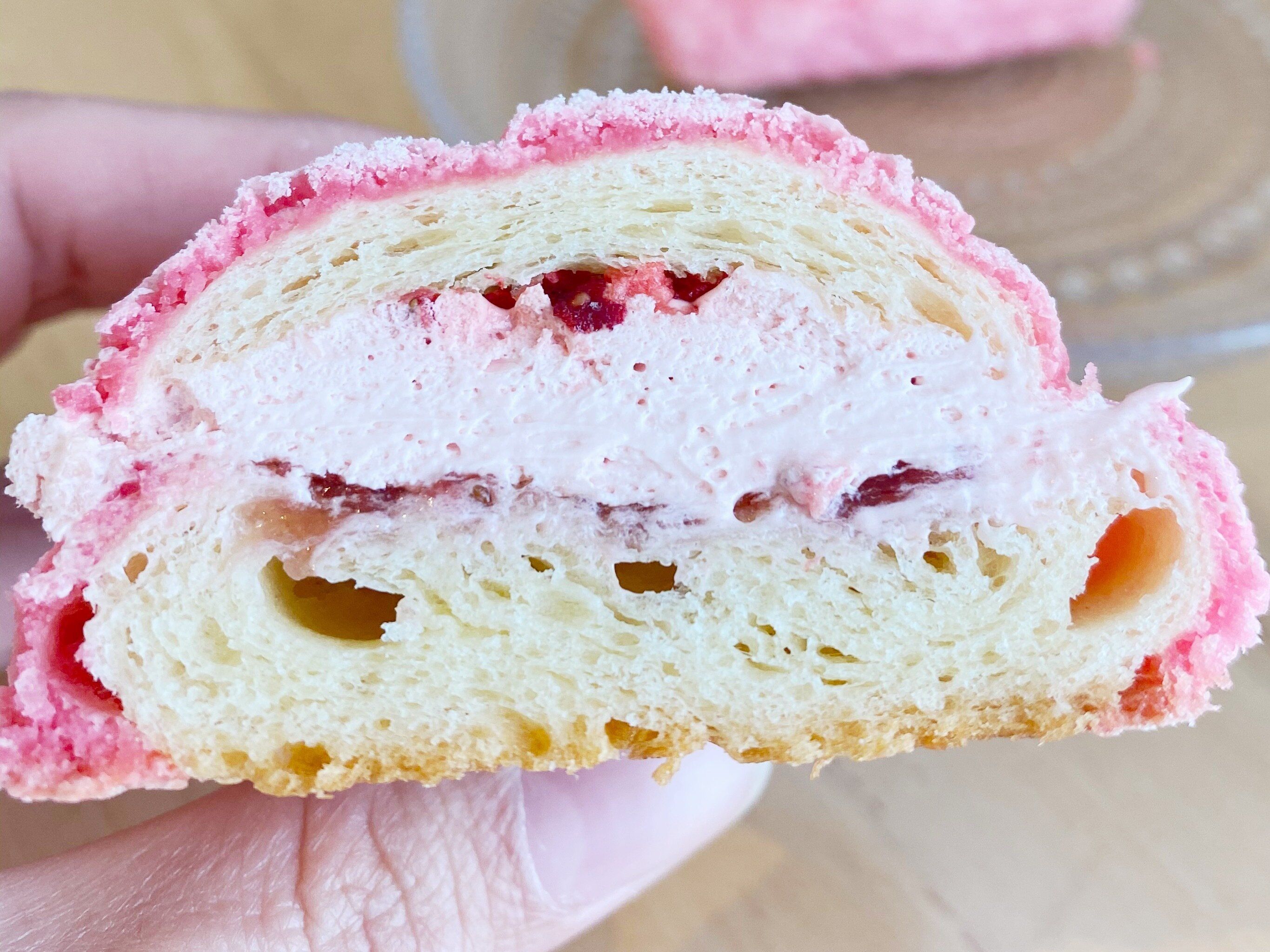 表面のマカロン生地はサクフワ食感でしっかりと甘さがあります。いちごポイップのミルキーさ、いちごジャムの甘酸っぱさ、フリーズドライのいちごのつぶつぶ感、いちごづくしながらもそれぞれの違うおいしさを味わえます。シンプルなデニッシュ生地のパンとも相性がよく、一瞬「マカロンを食べているのでは?」と思うほど、マカロン感を味わえるパンです。