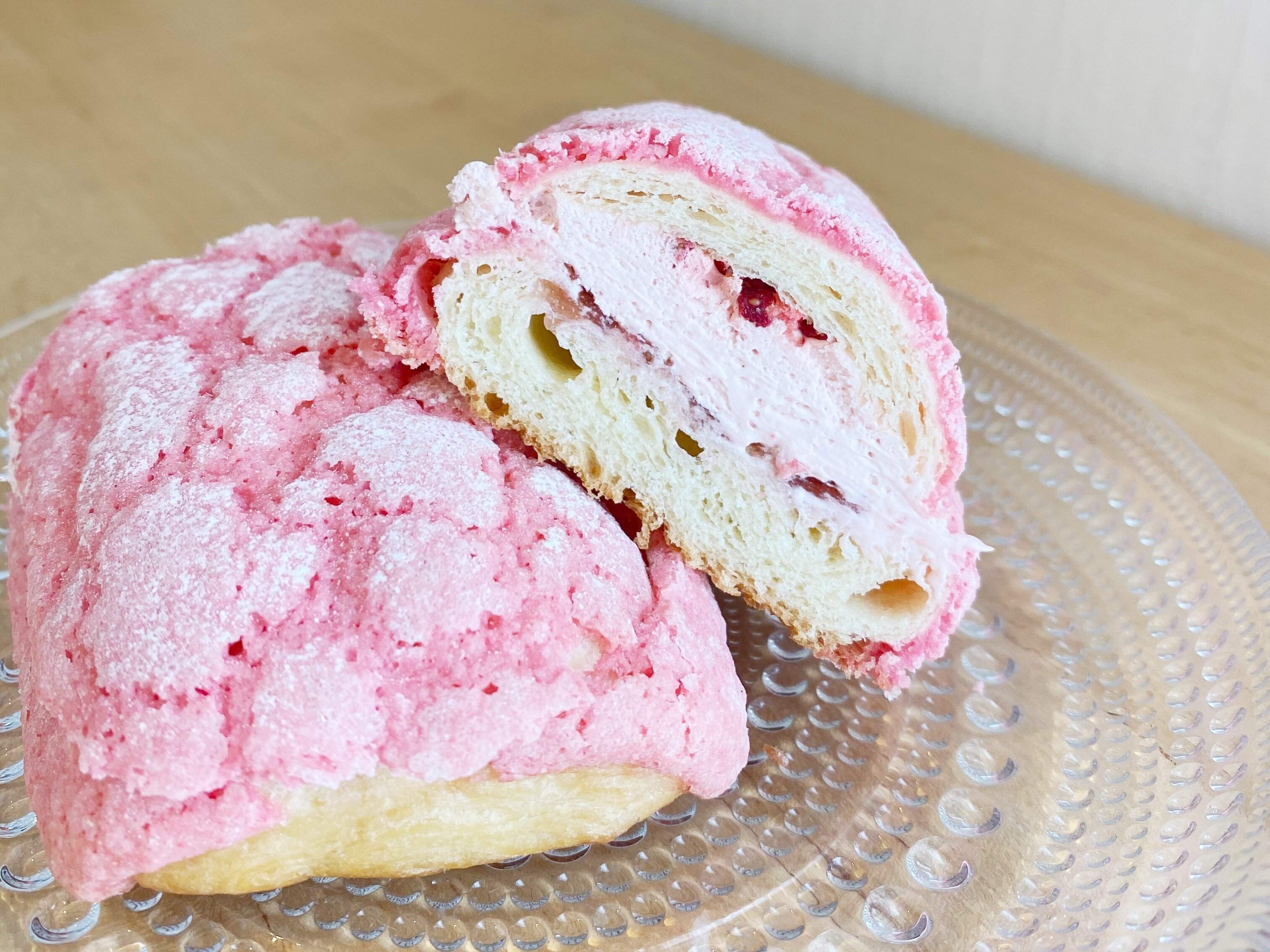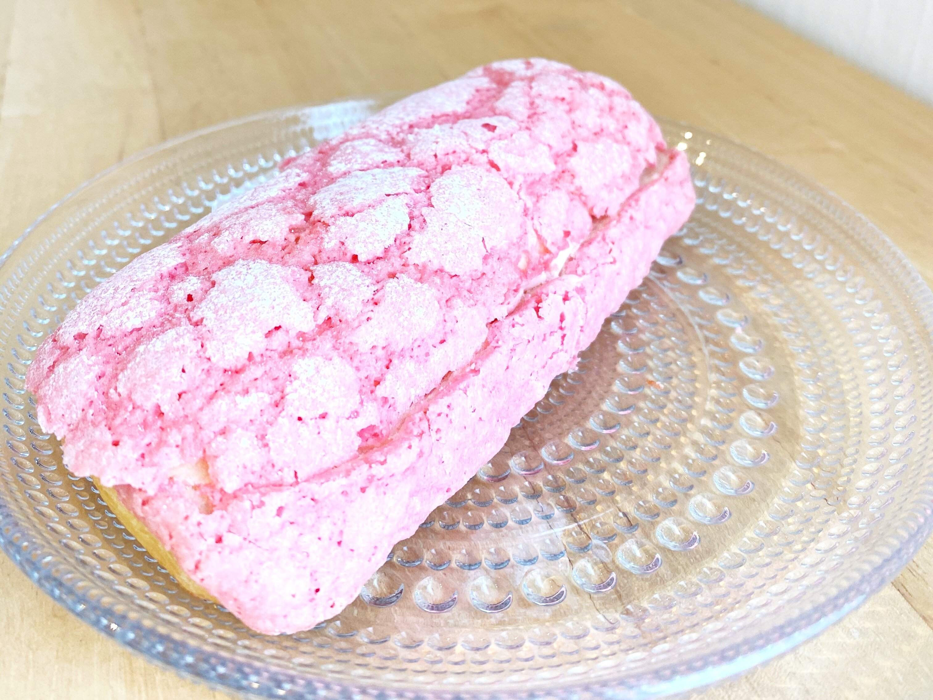デニッシュ生地にいちご味のマカロン生地をのせて焼き上げ、いちごホイップとイチゴジャム、いちごのフリーズドライをサンド。見た目も春らしい“いちごづくし”の菓子パンです。425kcal、150円(税込)。