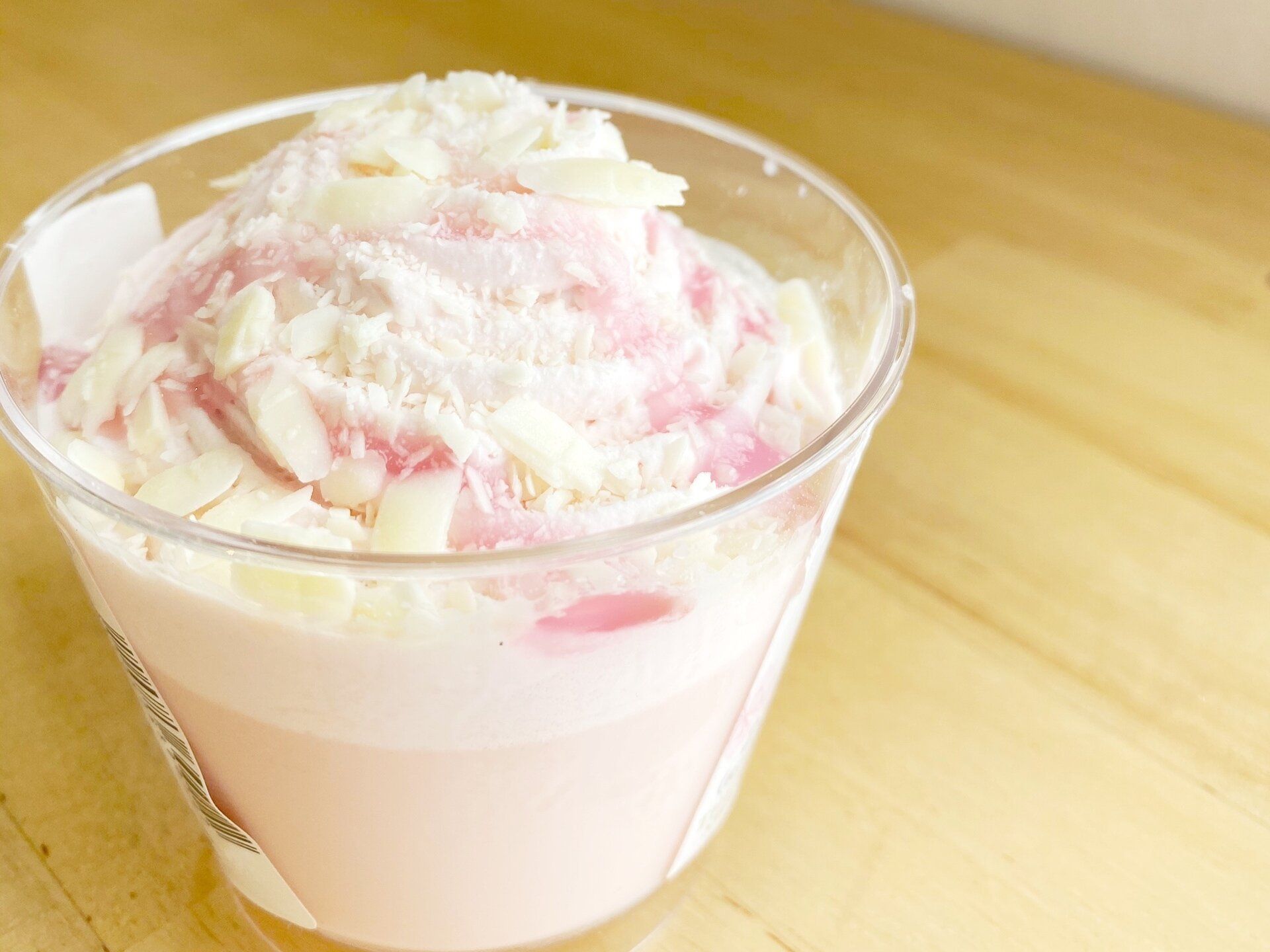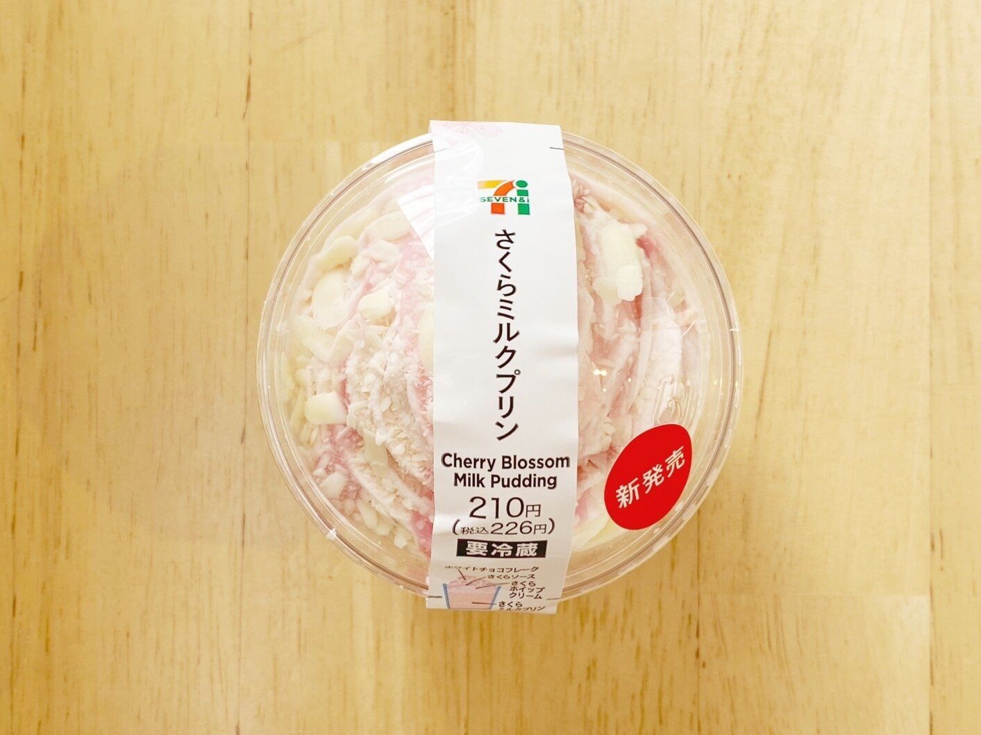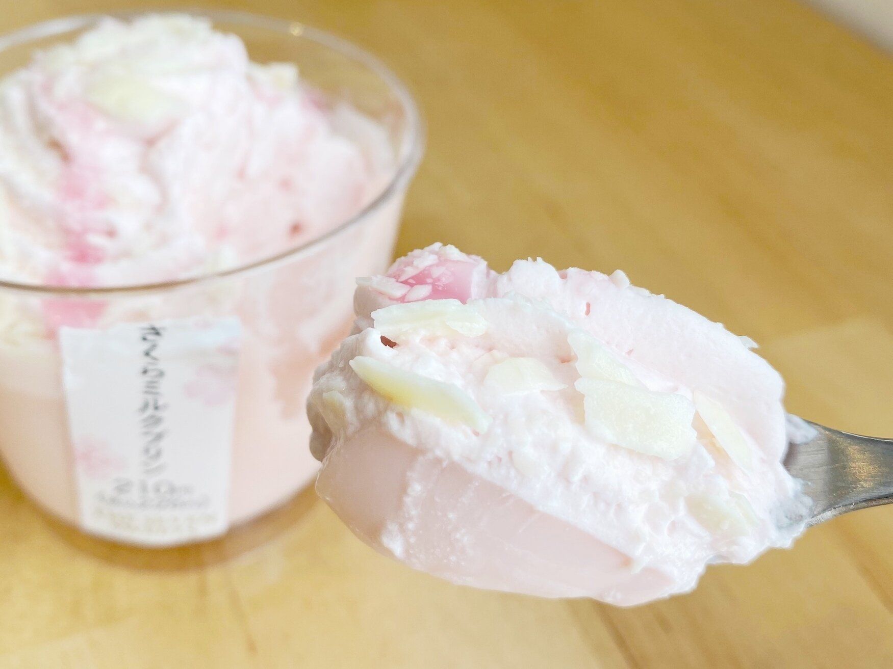 下層から、さくらミルクプリン、さくらホイップ、さくらソース、ホワイトチョコチップと桜づくしです!