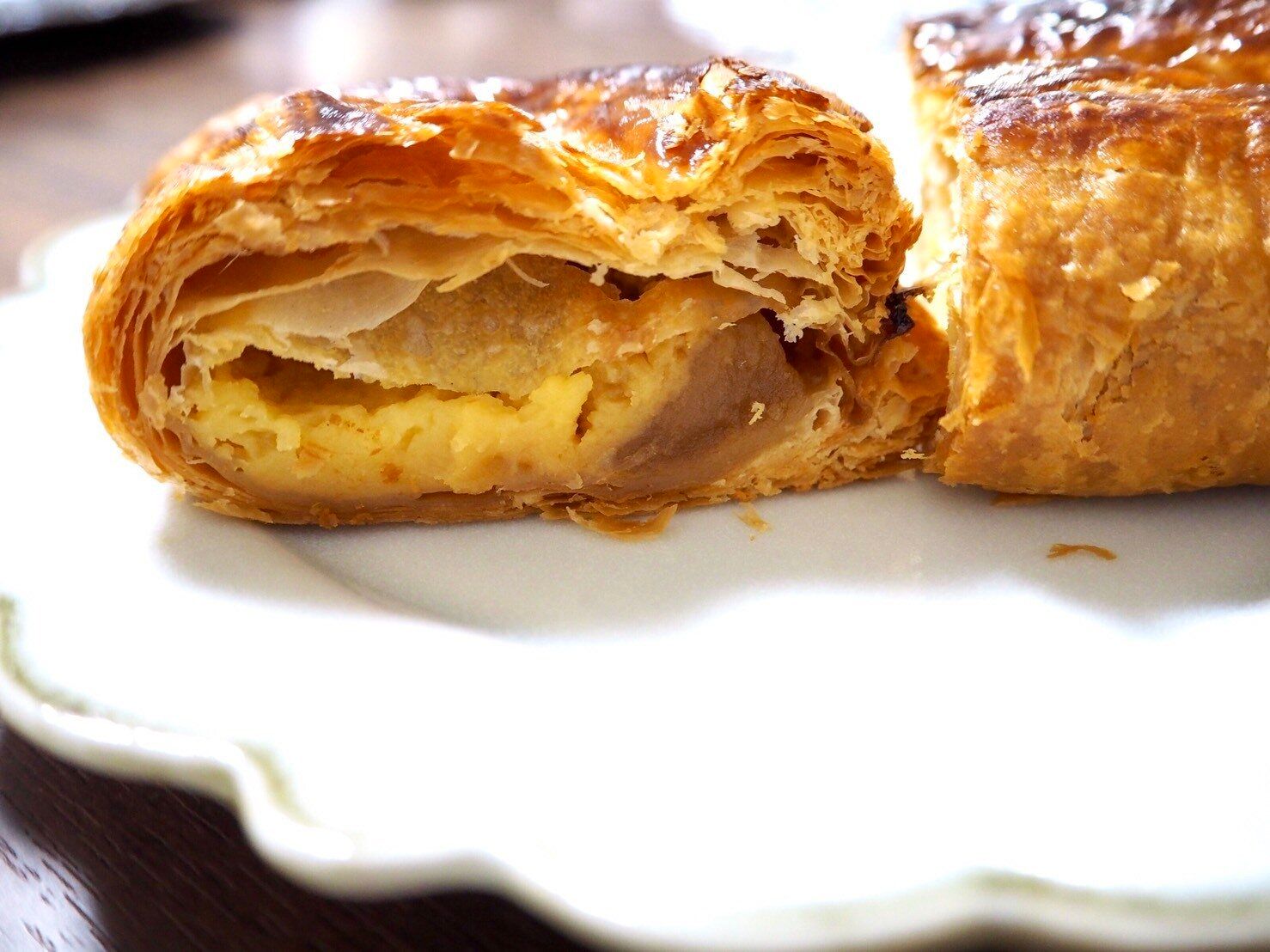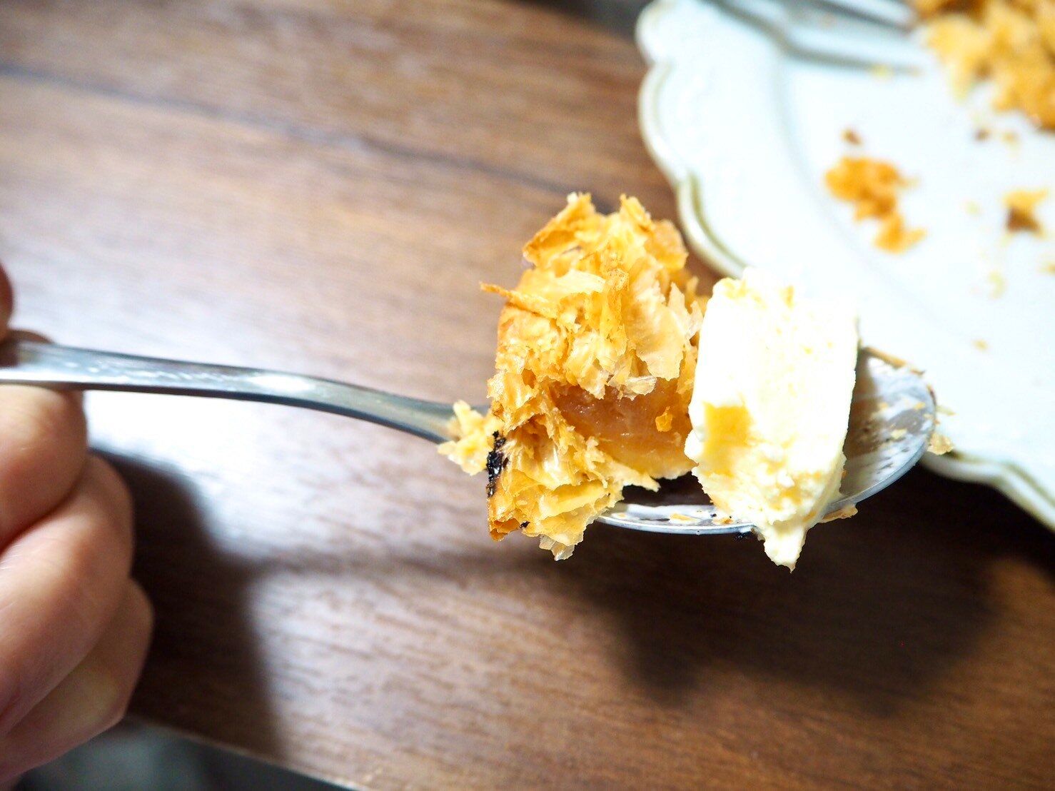 パイ生地が本当にサクサクだからこそ、ぽろぽろと生地がこぼれていきます。フォークだと若干食べづらいので、ペーパーに包んでかぶりつくのが良いかも。