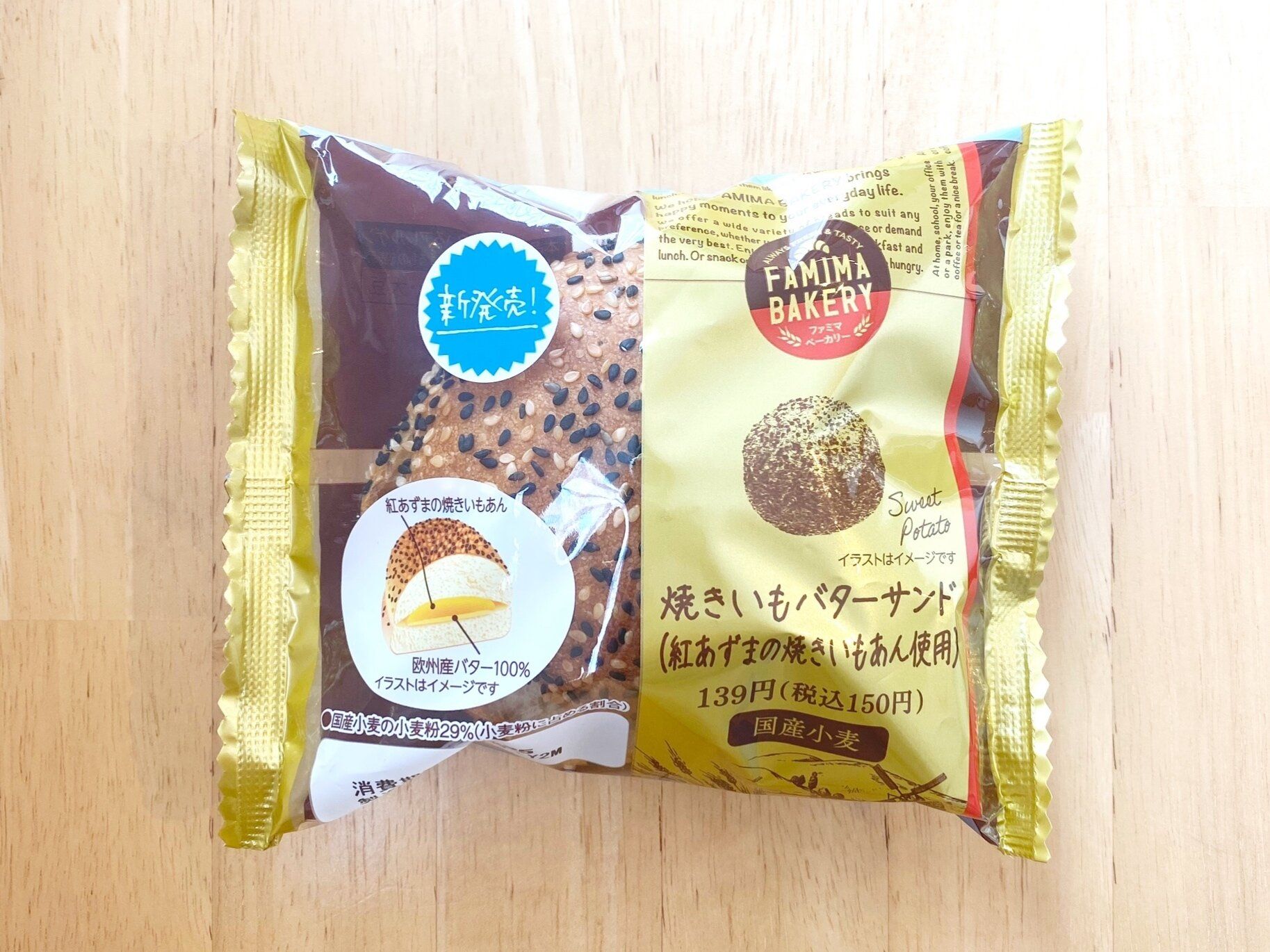 もちっとした食感の高加水パン(水分量が多いパン)で、紅あずまの焼きいもあんと、欧州産バターをサンドした菓子パン。276kcal、150円(税込)。