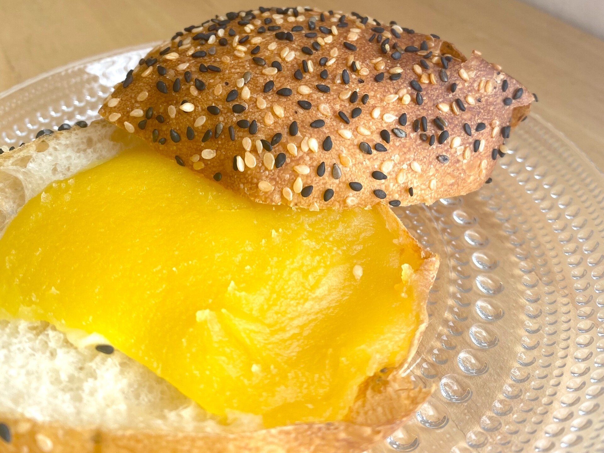 ふわっとしたパン生地の表面は黒胡麻と白胡麻がぎっしりとトッピングされていて、真ん中には色鮮やかな焼きいもあんとバターがサンドされています。