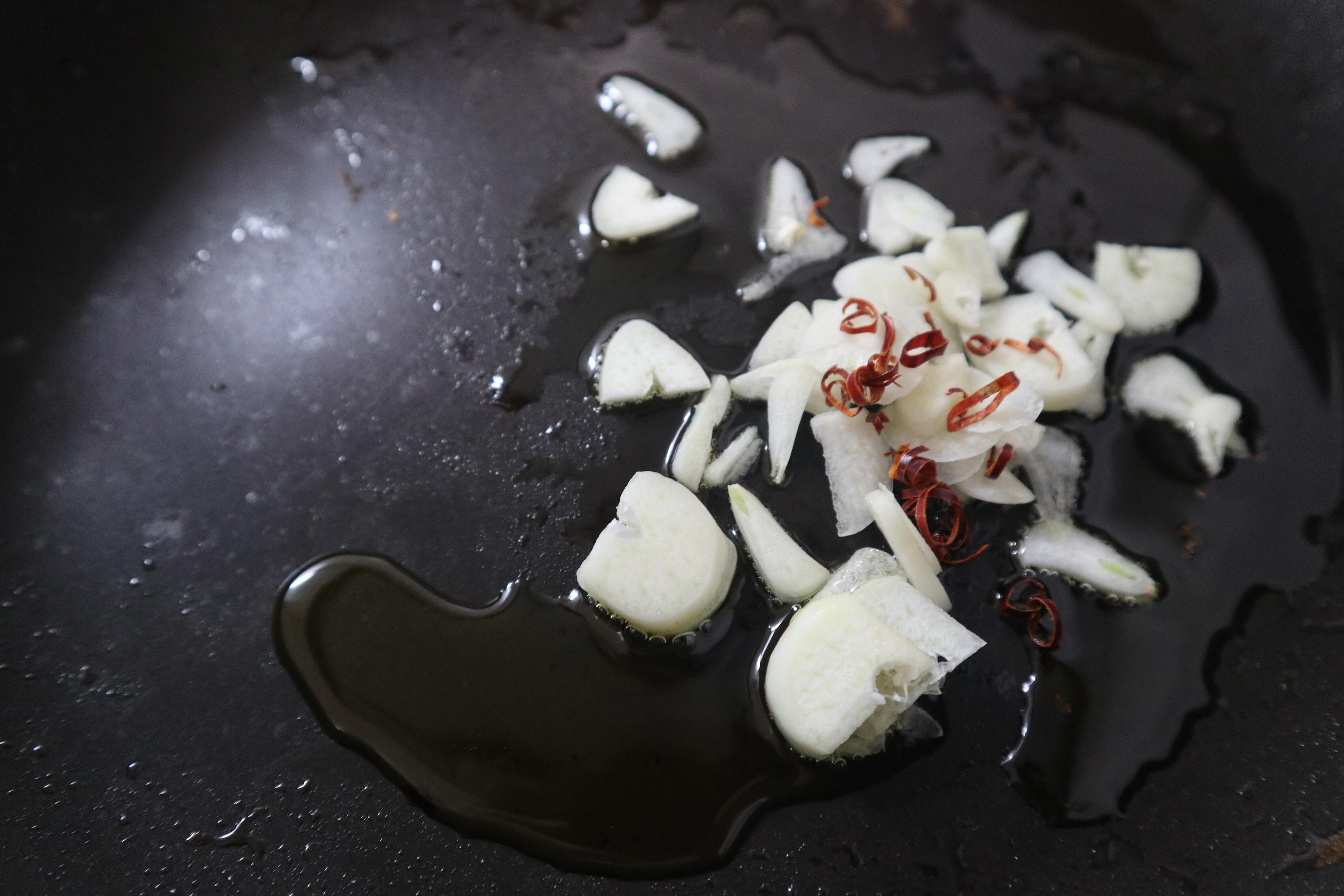 1.フライパンを中火にかけて、オリーブオイル、ニンニク、鷹の爪を加えて炒める。