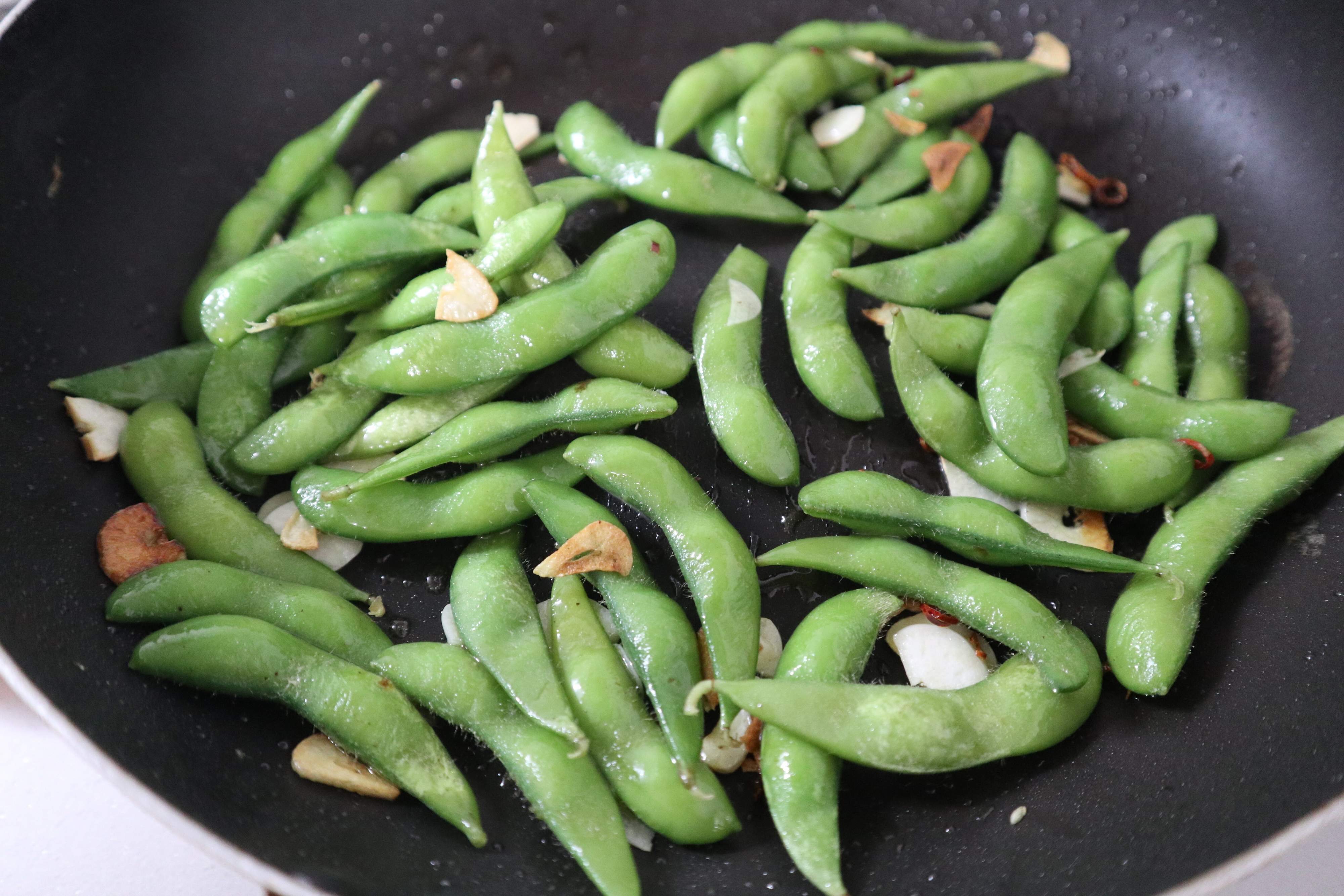 2.ニンニクの香りが立ってきたら、枝豆を加えて炒める。