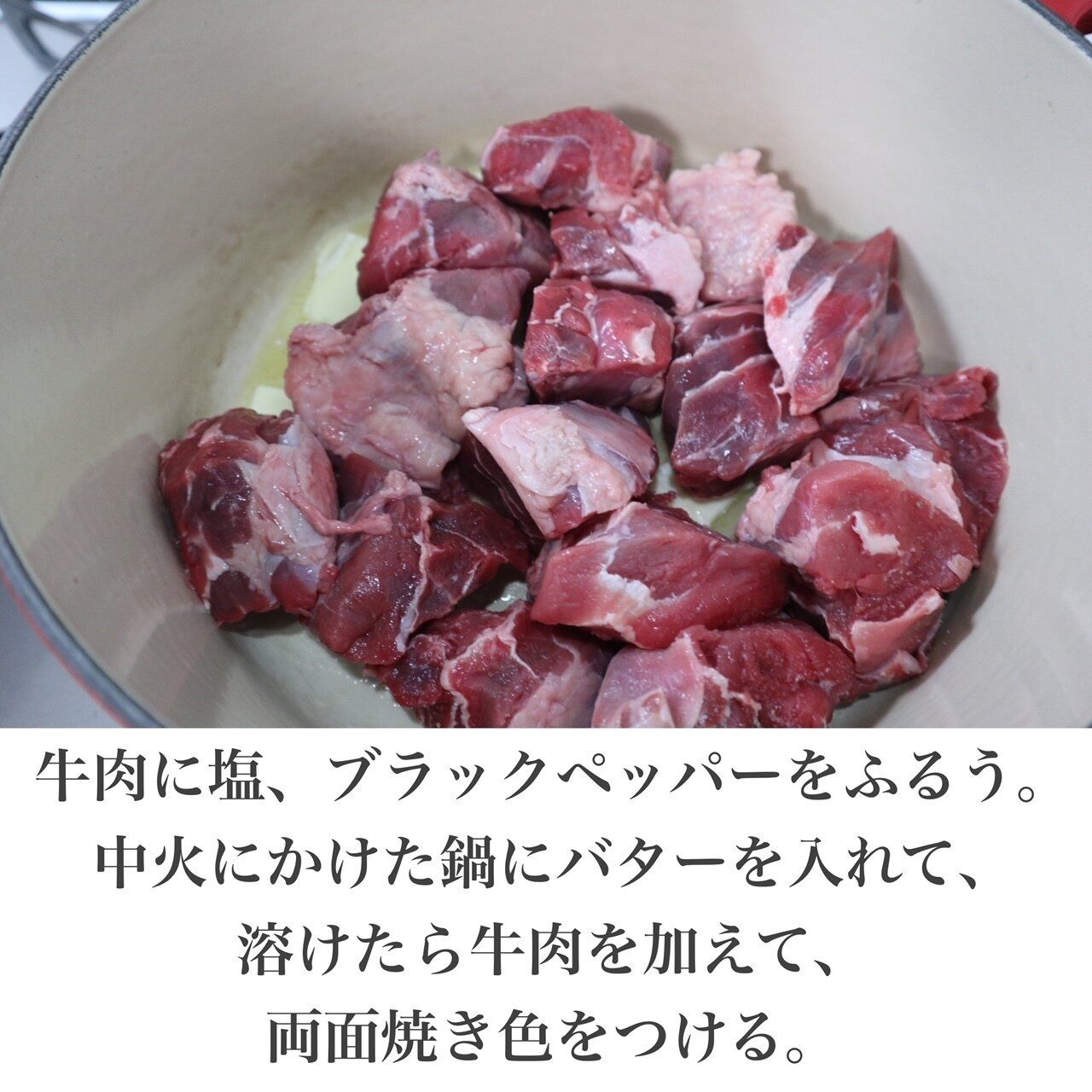 1.牛肉に塩、ブラックペッパーをふるう。鍋を中火にかけてバターを入れる。溶けたら牛肉を加えて、両面こんがり焼く。