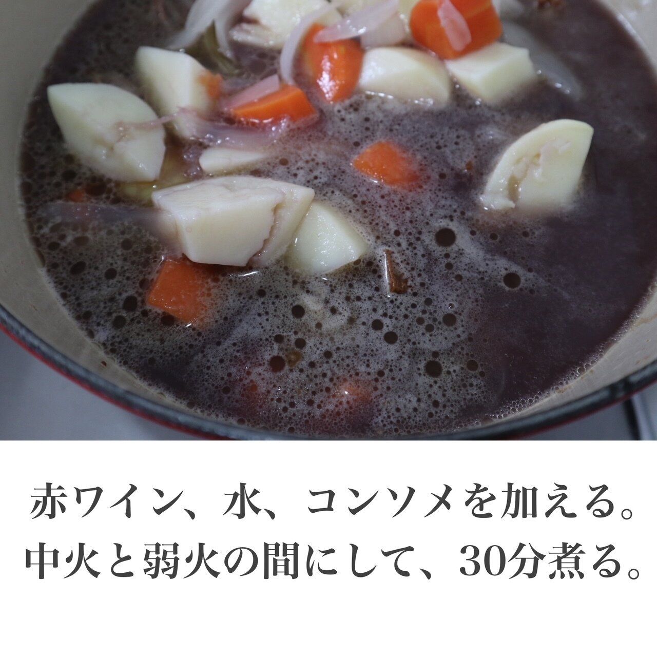 3.水、赤ワイン、コンソメを加えて、中火と弱火の間に変えて30分煮る。