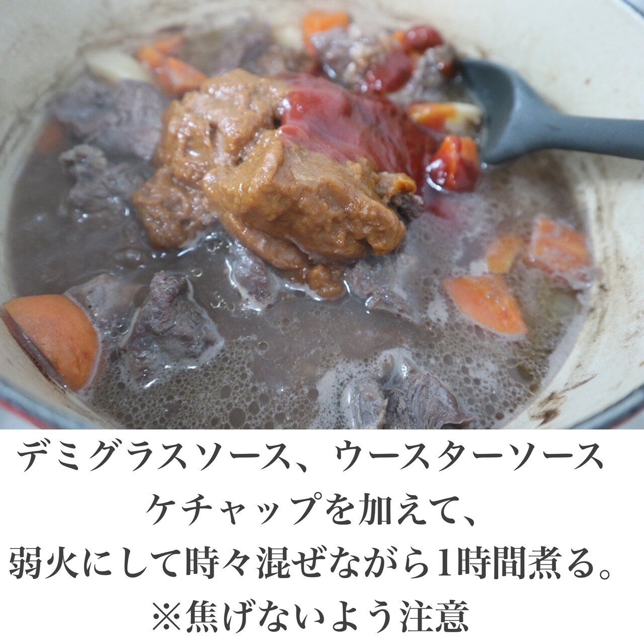 4.デミグラスソース、ウースターソース、ケチャップを加えて、弱火にして1時間煮ます。