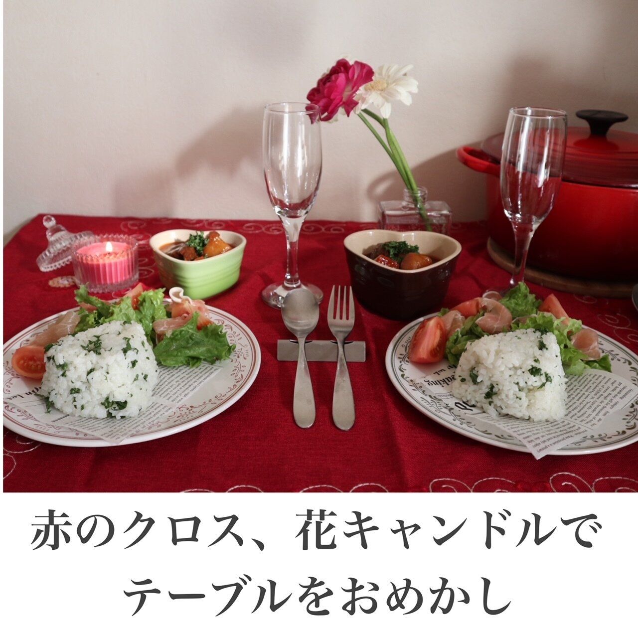 赤いクロスやお花、キャンドルでおもかし。