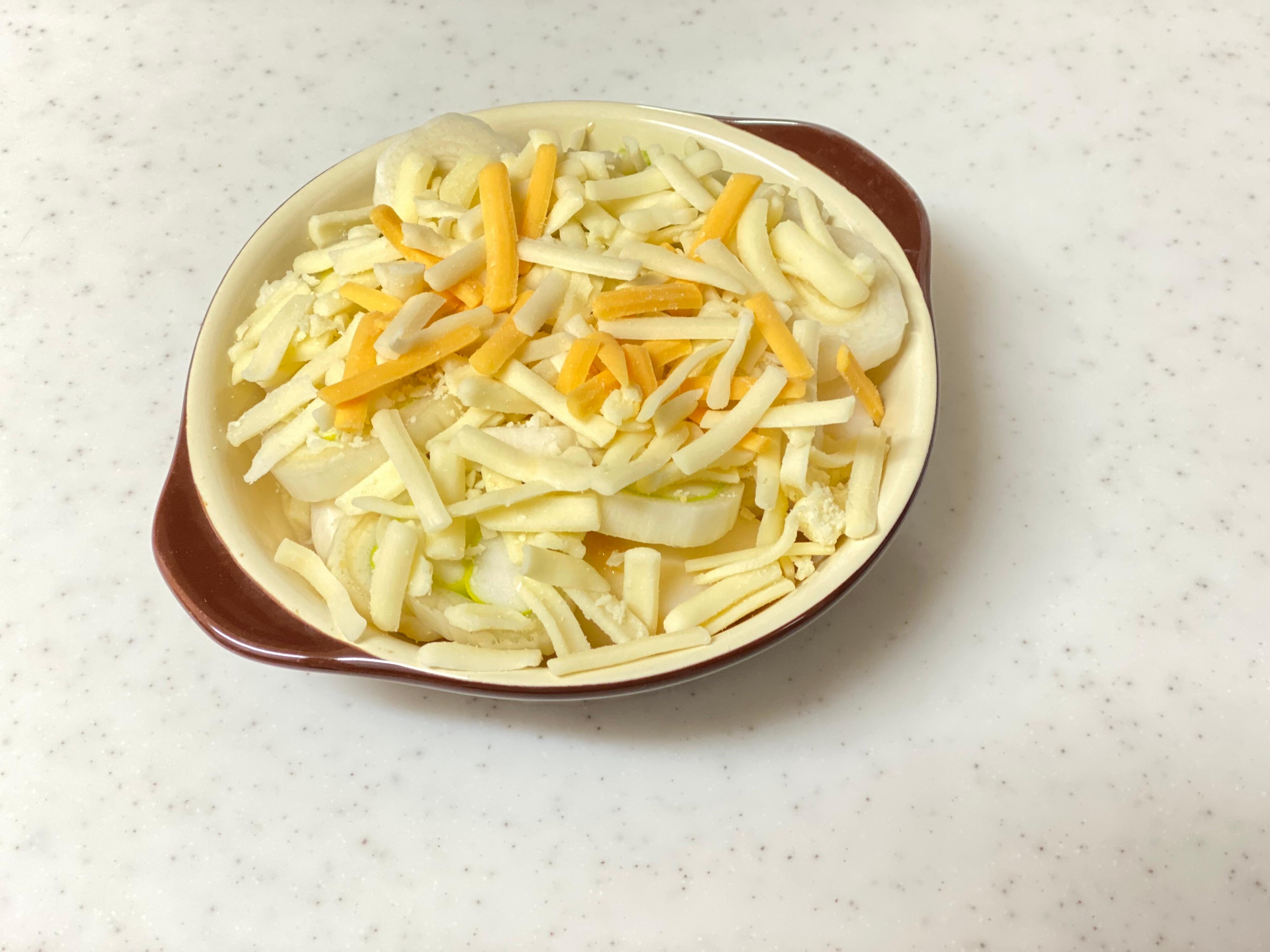耐熱皿に材料をいれて、合わせ調味料とチーズをたーっぷりかけて焼くだけでOK!これだけで1品が完成しますよ。