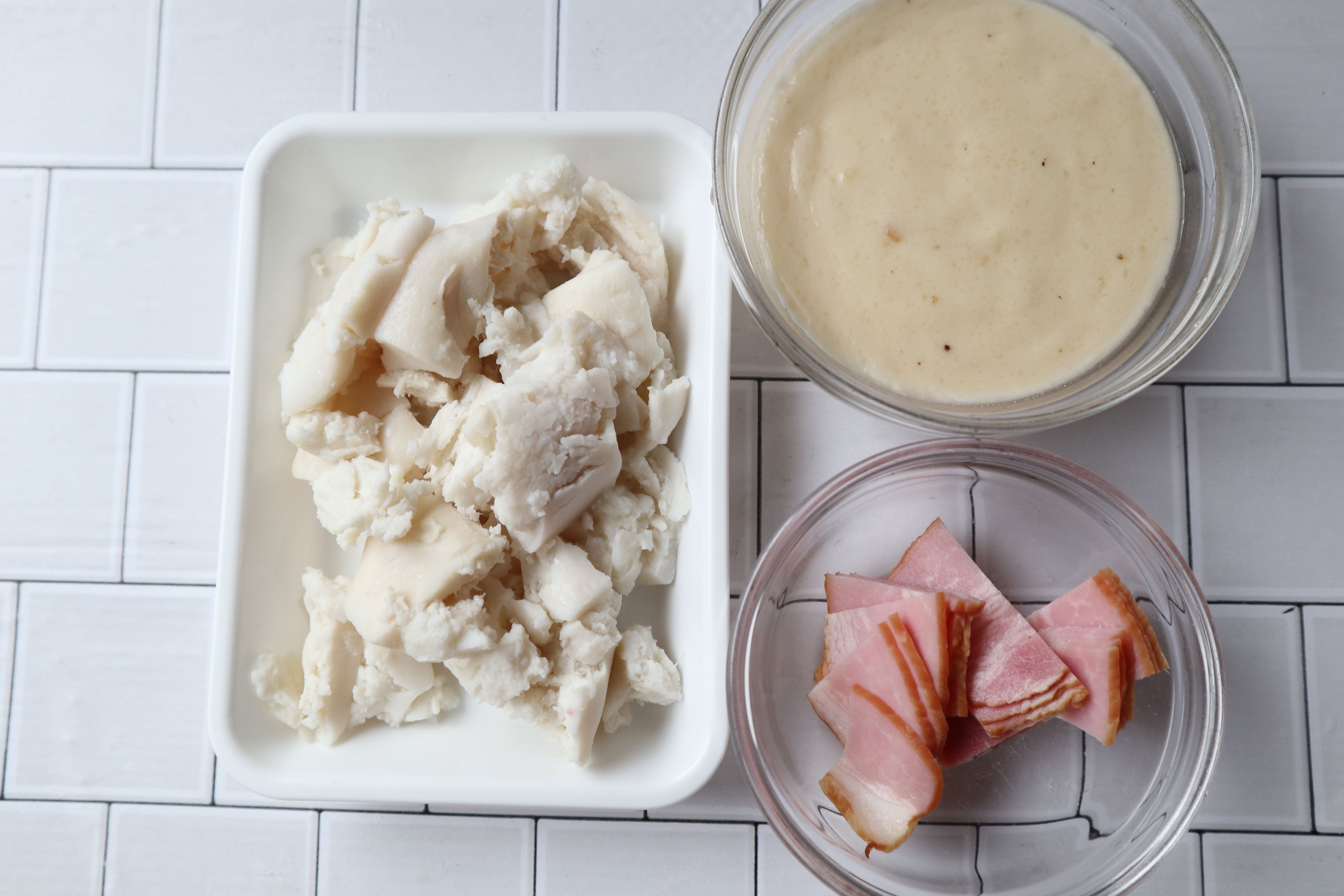 1.ボウルに水けを切った里芋を入れてマッシャーでつぶす、ホワイトソース、ベーコンも加えて混ぜる。