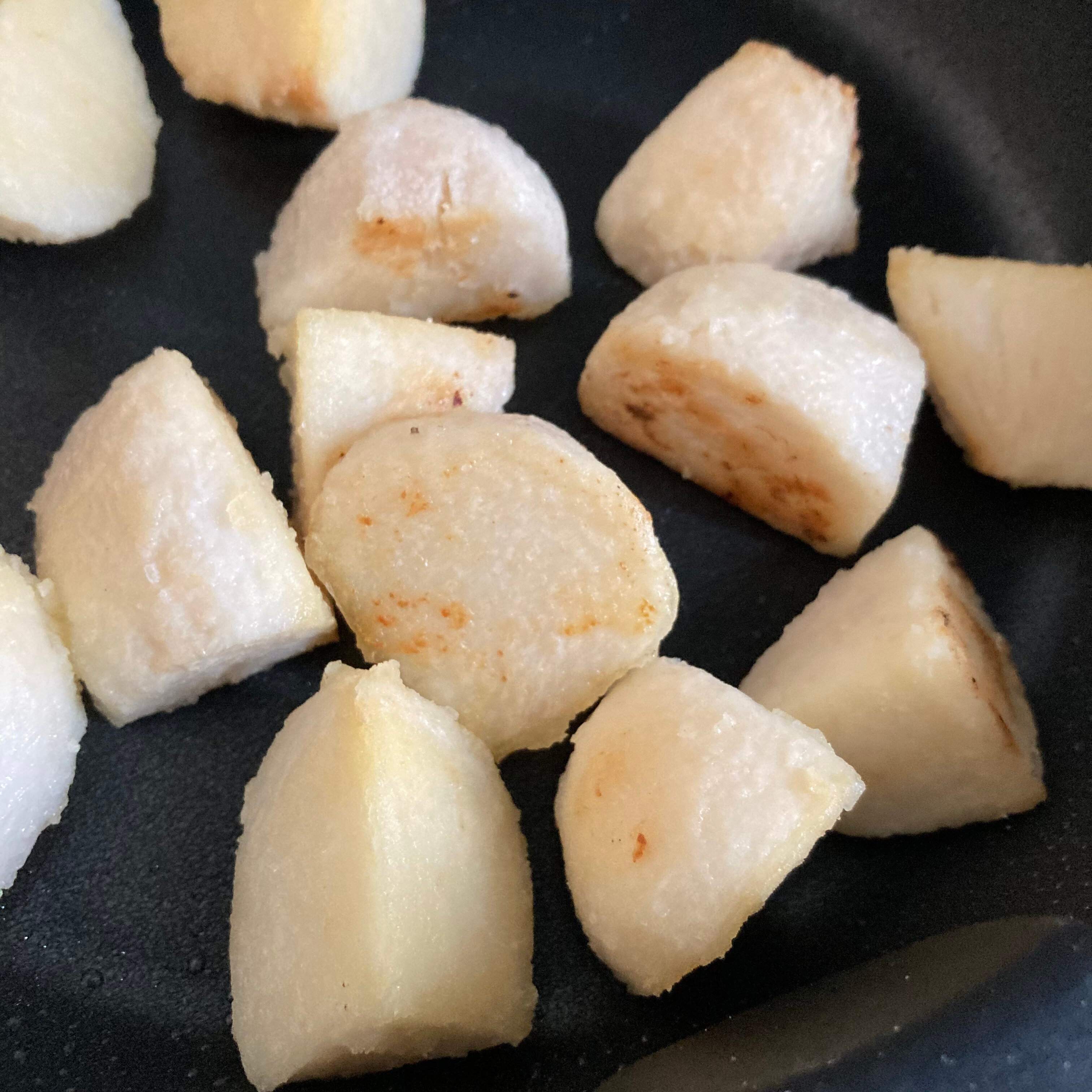 3、フライパンにバターを入れ、溶けたら2の里芋を入れ全体がこんがり焼き色がつくまで炒めます。