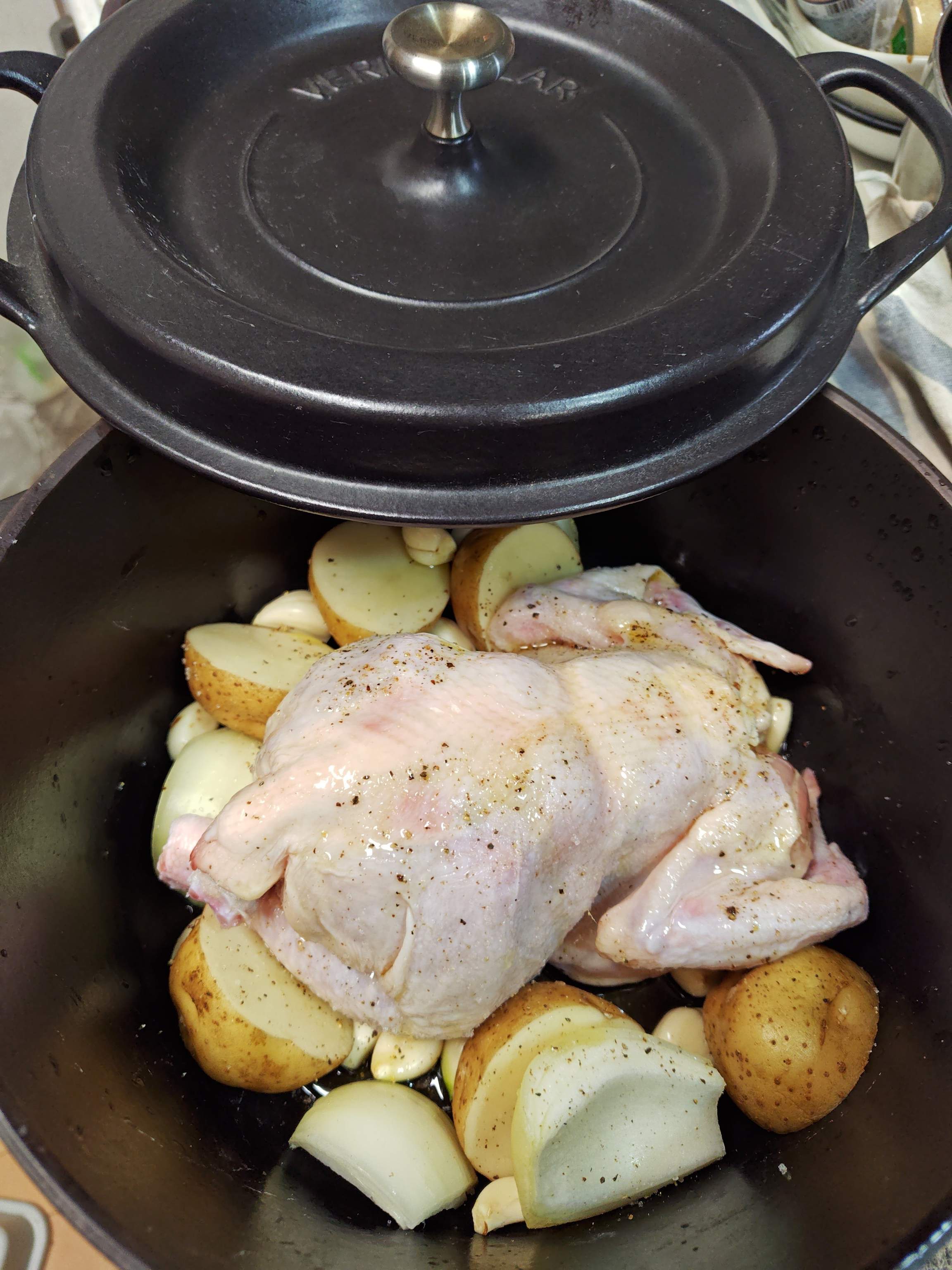 オーブンに入れている丸鶏の仕上がり時間を気にしながら
