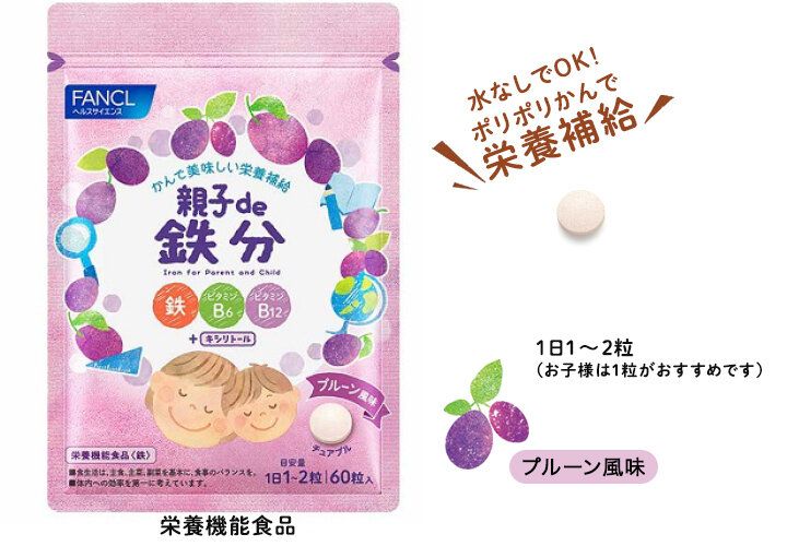 化粧品はもちろん、健康食品でもおなじみのファンケルから販売されているのが親子で一緒に食べられる「親子de 鉄分」。子どもから大人まで手軽に栄養補給でき、ビタミンB6、ビタミンB12、ビタミンC、亜鉛も配合された商品です。また、甘味料は虫歯の原因になりにくいキシリトールを使用しています。
