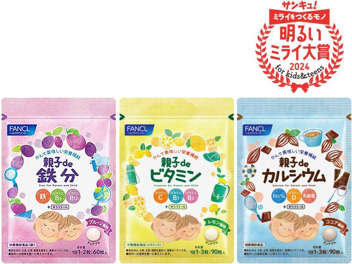 「親子de シリーズ」は、「親子de 鉄分」のほかに、「親子de ビタミン」「親子de カルシウム」の3種類。このシリーズは、これまで子ども向けにはあまりなかったサプリメントなうえ、親子で一緒に食べられる注目商品として、サンキュ!の「明るいミライ大賞2024 for kids&teens」を受賞しました。