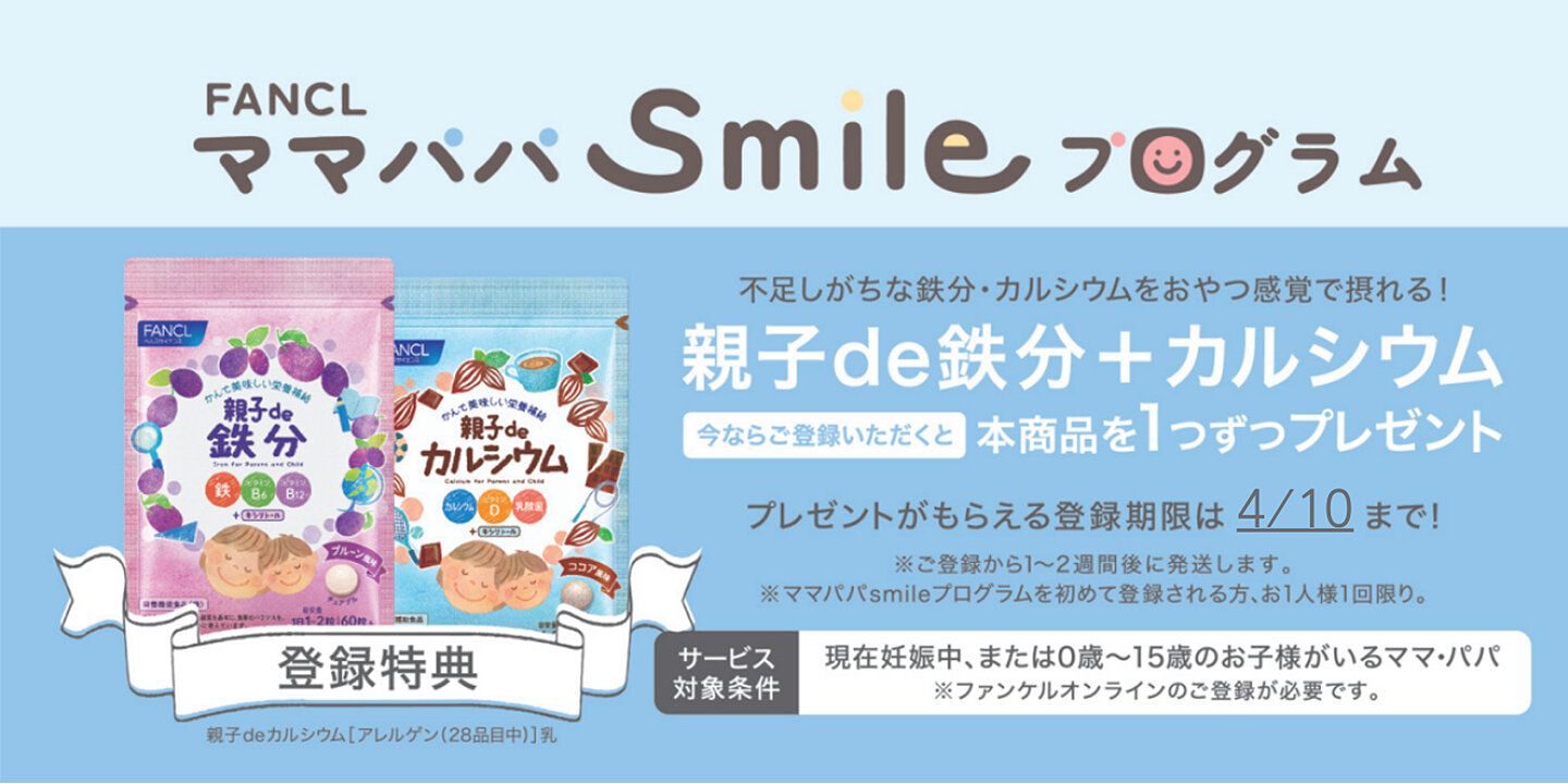 もうひとつおすすめなのが、ファンケルが昨年8月からスタートした「ママパパsmileプログラム」。現在妊娠中の方、または0歳~15歳の子どもがいるママ・パパを応援するプロジェクトで、うれしい特典がいっぱい!