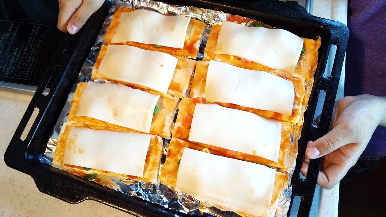 4. その上にミックスベジタブルを並べ、最後に「パイシート」に合わせてカットしたスライスチーズをかぶせる。