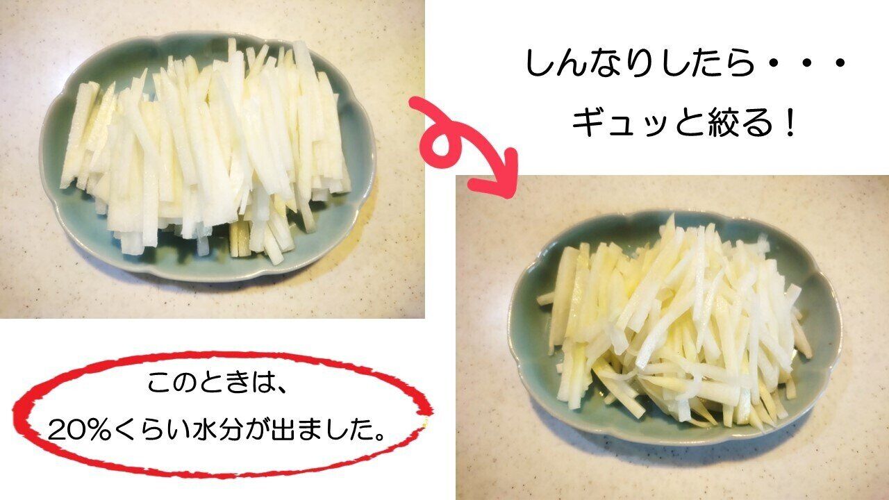 このとき、絞りが足りないと塩気がたくさん残るので、大根がしなしなとやわらかくなるくらいを目安に水分を絞ってみてくださいね。