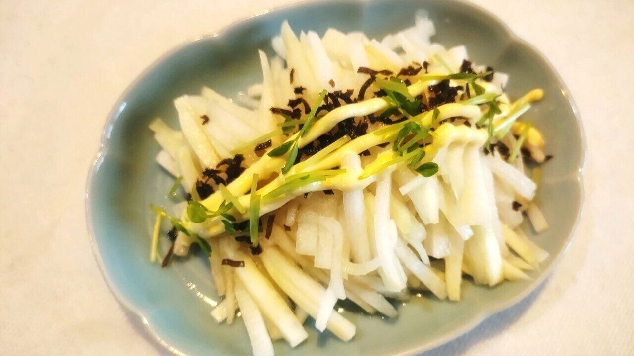 2. 皿に大根を広げ、刻んだ塩昆布をのせ、ポン酢しょうゆ、マヨネーズを回しかける。