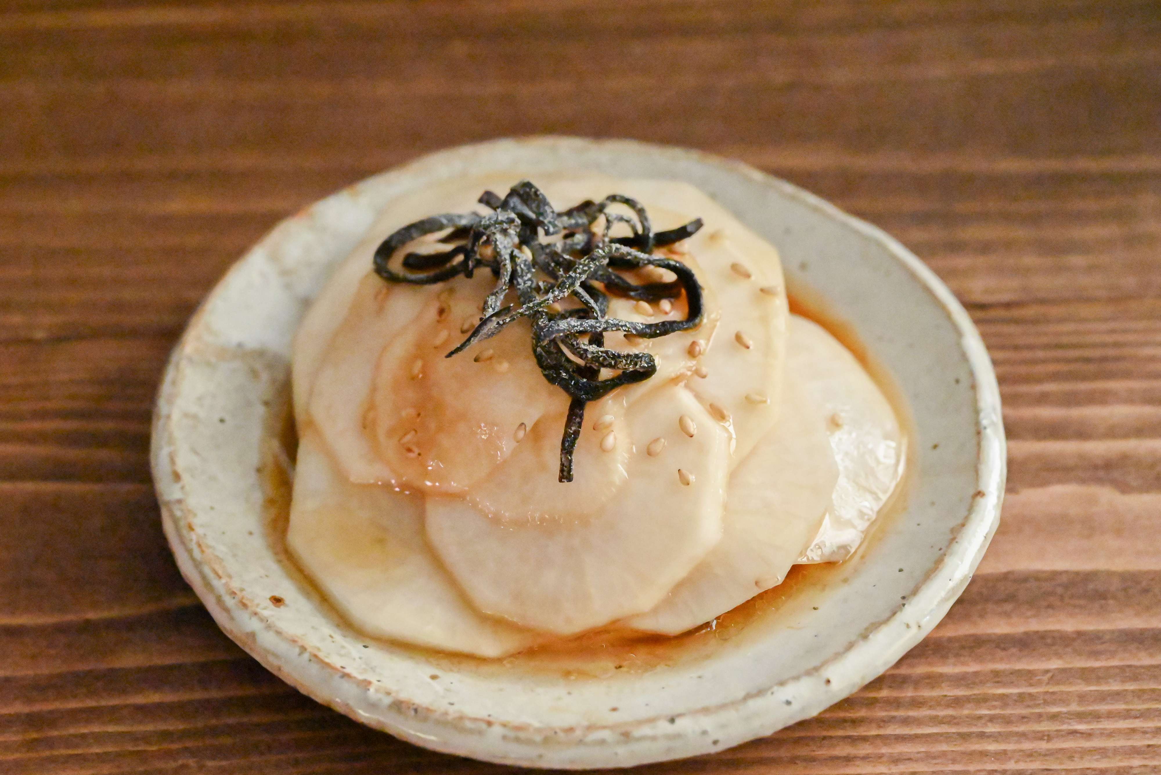 陶器の皿に盛られたかぶの塩こんぶ炒め