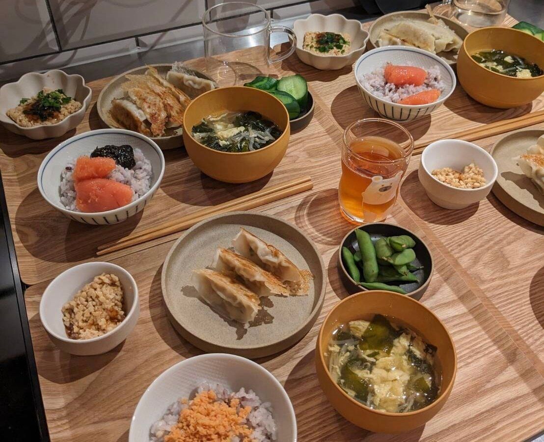 「冷凍餃子」、「冷凍えだまめ」、「納豆」は焼いただけ、解凍しただけ、盛り付けただけのモノ。そして、「きゅうりの浅漬け」は前日の残り物です。
