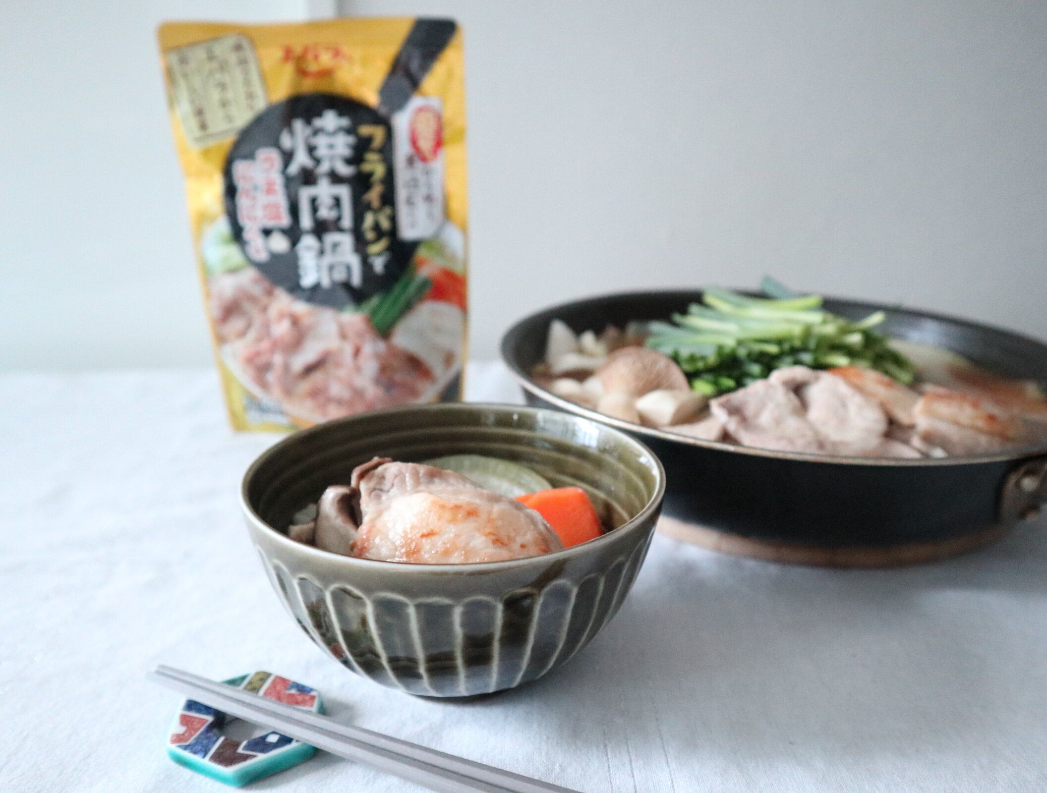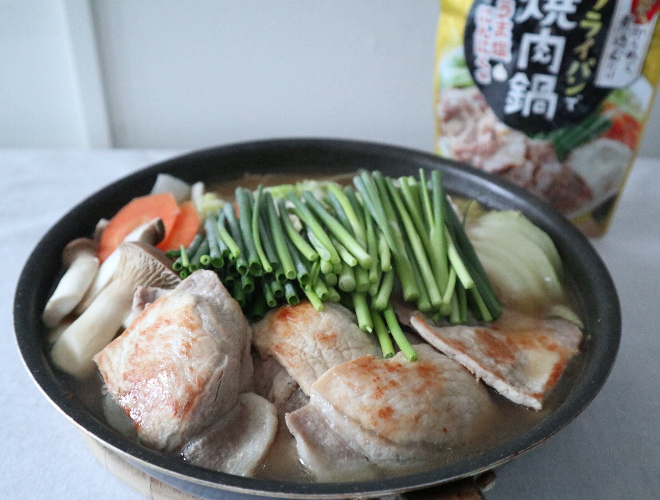 エバラの“フライパンで焼肉鍋-うま塩&ニンニク”鍋つゆを使いました。フライパンごと食卓に出すスタイルです。洗い物も少なくていいですよね。