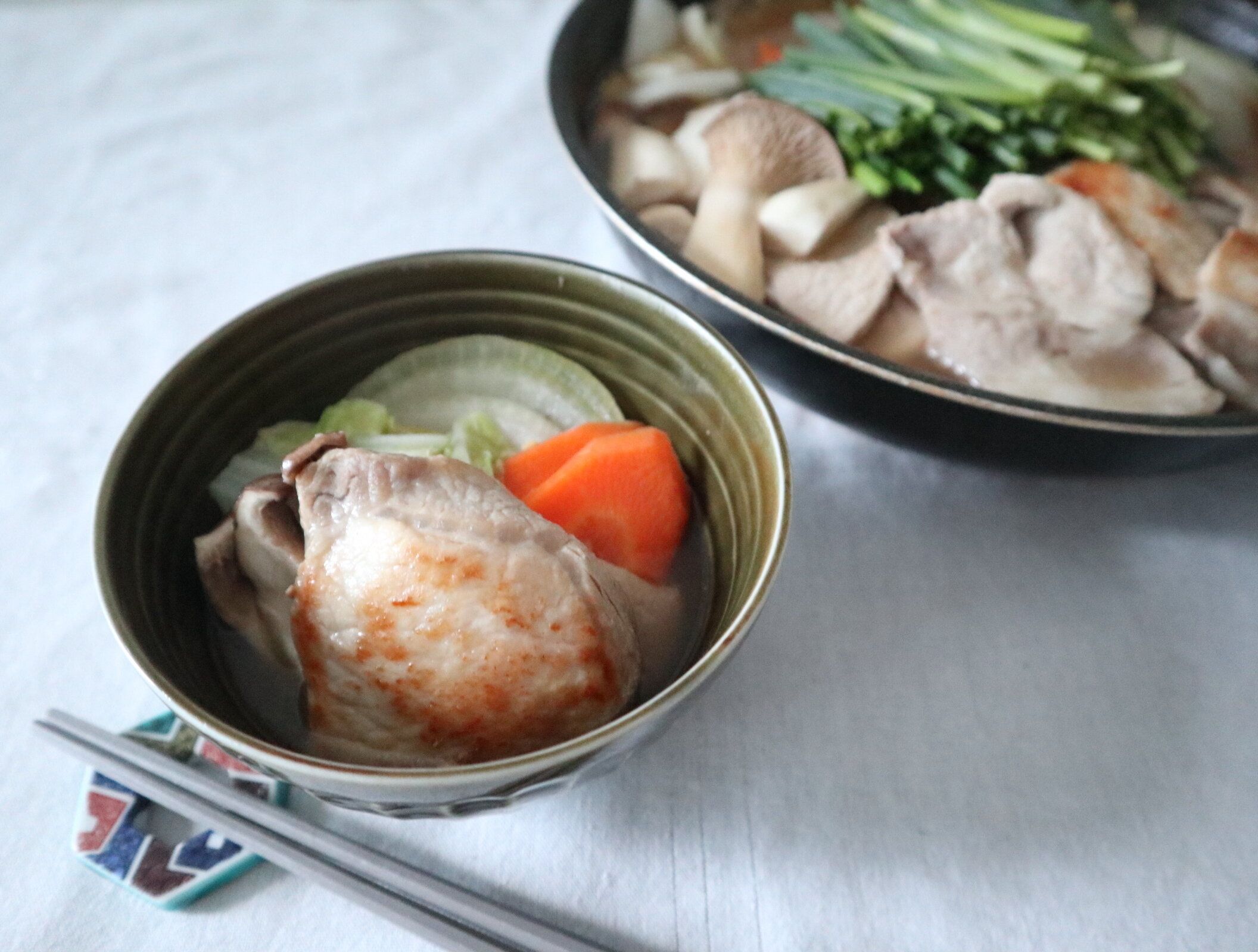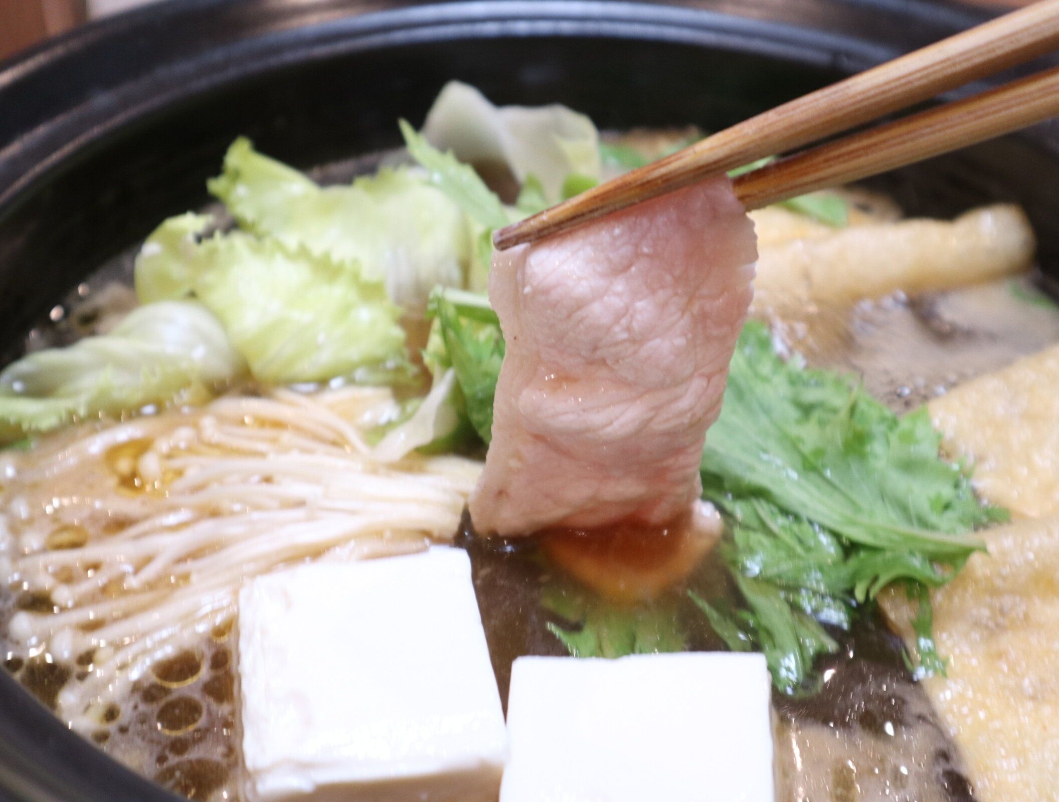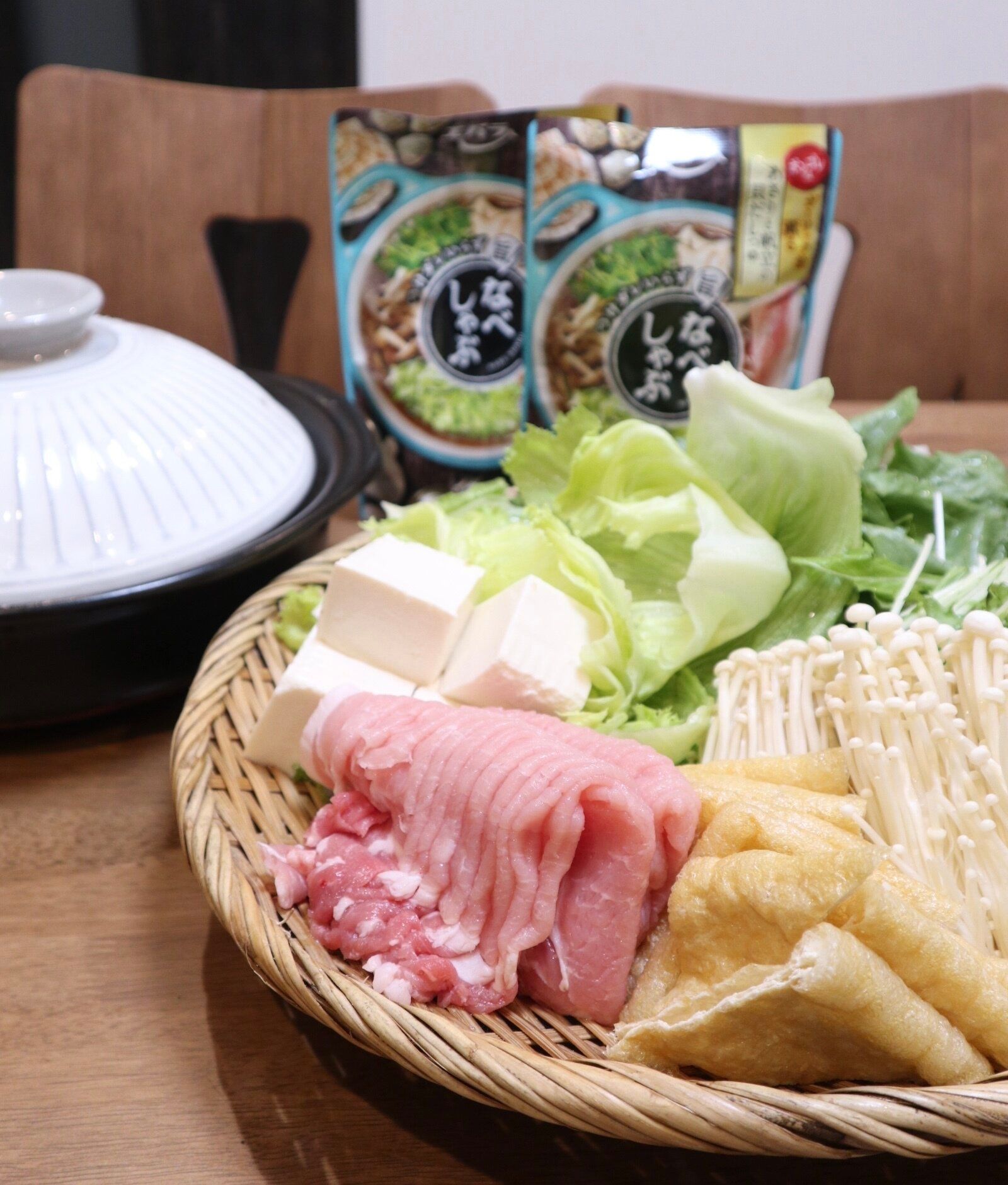 この日は、同じ鍋つゆを使っています。具材は、豚肉、豆腐、えのき、レタス、水菜、油揚げです。
