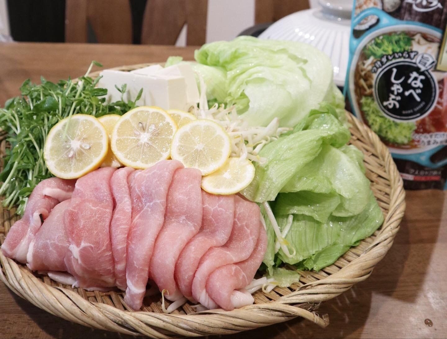 エバラの“なべしゃぶ-あさりと帆立の貝だしつゆ-”鍋つゆを使いました。国産のレモンが手に入ったのでレモン鍋にしましたよ。具材は、豚肉、豆苗、もやし、レタス、豆腐です。