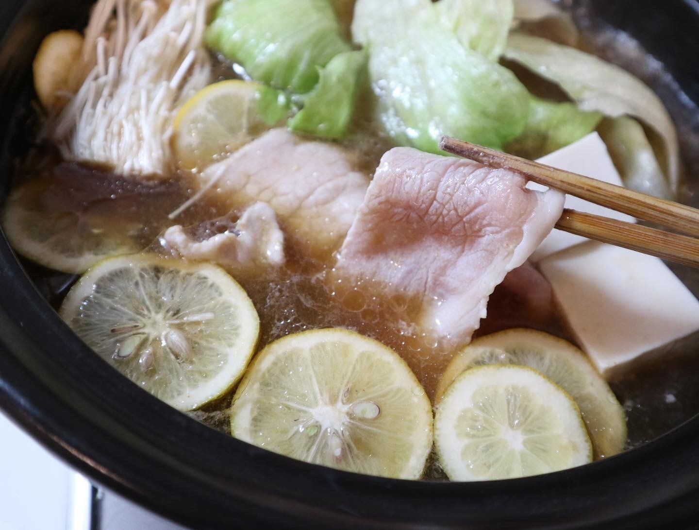しゃぶしゃぶするだけで、しっかり味がつくので鍋つゆいらずです。レモンのさっぱり感もあって、いくらでも食べられます。