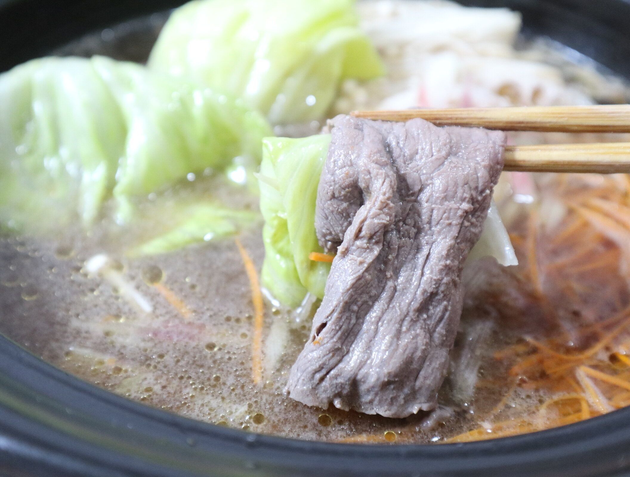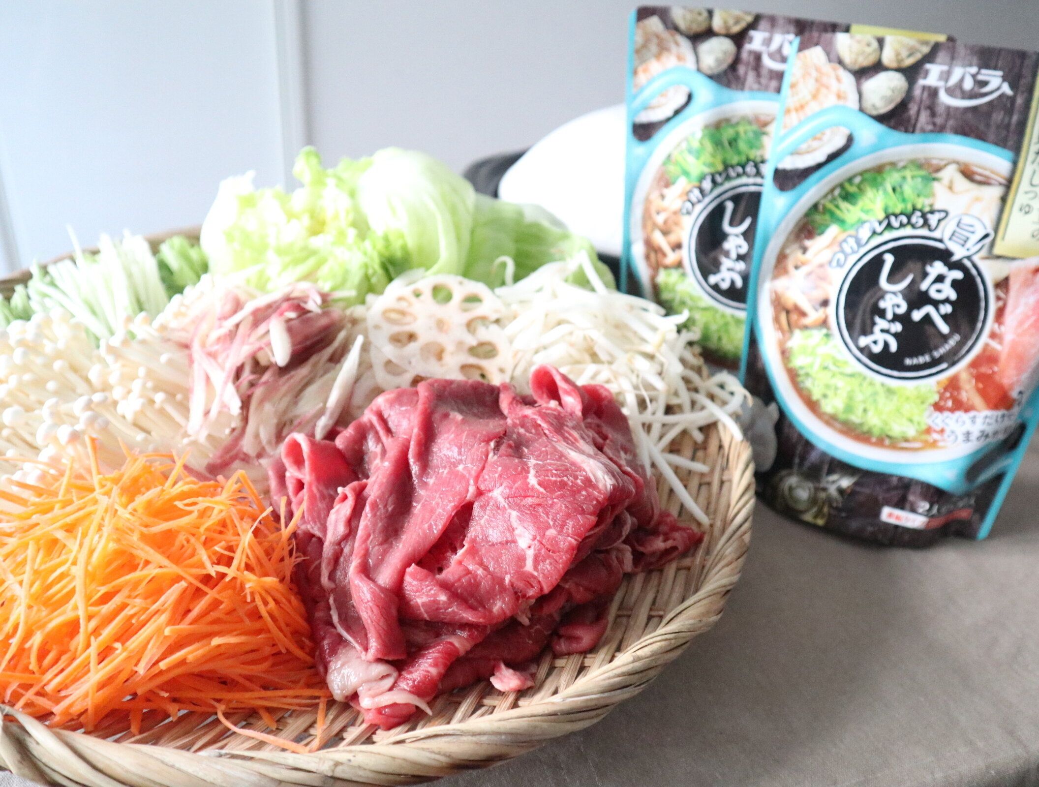 この日も同じ鍋つゆを使いました。具材は、牛肉、人参、茗荷、えのき、蓮根、もやし、水菜、レタスです。