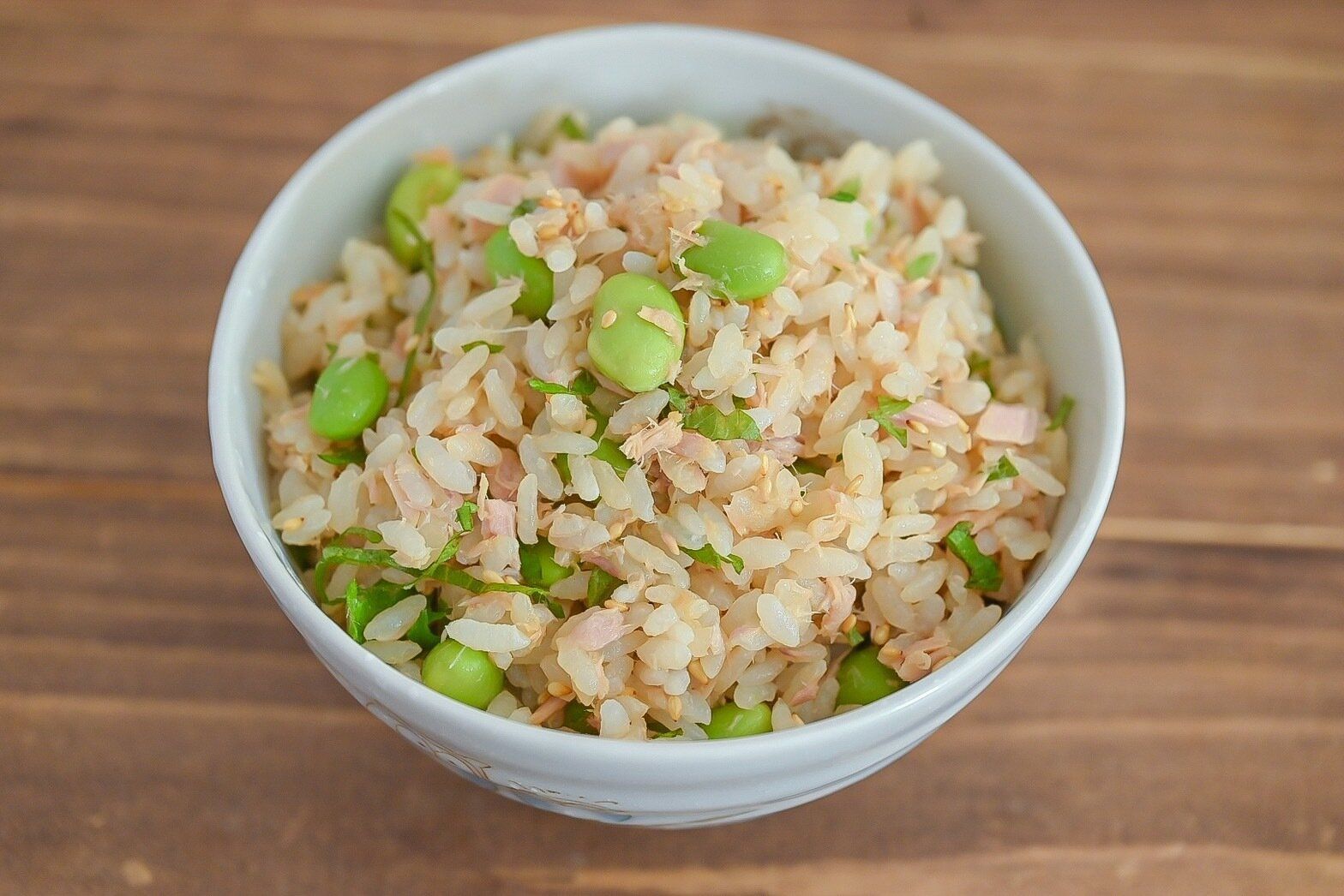 (2)炊いたごはん、ツナ缶、枝豆、白ごま、しょうゆをしゃもじで混ぜて完成。