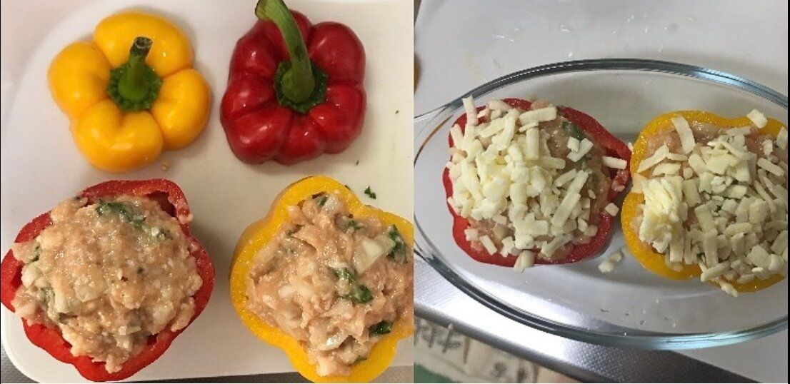 ③パプリカの中に①のミンチを詰めて上からチーズをふりかける