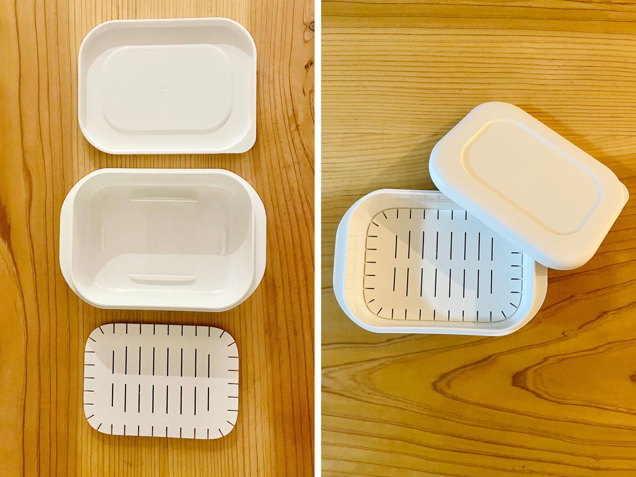 容器は薄く丸みがあり、ご飯を均一に温められる形状になっています。さらに、すのこパーツのおかげで余分な水分が下に落ち、ご飯がベチャッとしません。