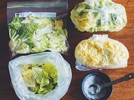 白菜など大型の野菜は、使う料理に合わせて切ってから冷蔵室へ。また、野菜の塩もみをまとめて作るなど、下ごしらえをルーティン化。