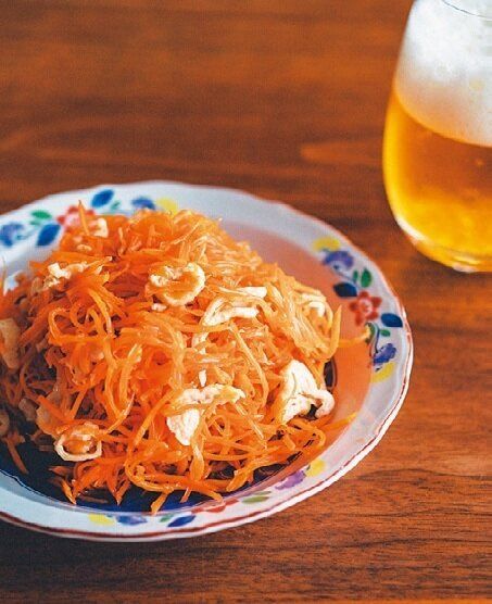 下ごしらえではがした鶏皮を捨てちゃうなんて、もったいなさすぎる!ゆでて、にんじんとともに甘酸っぱく味つけし、おつまみ兼おかずとして食べるのが野口さん流。