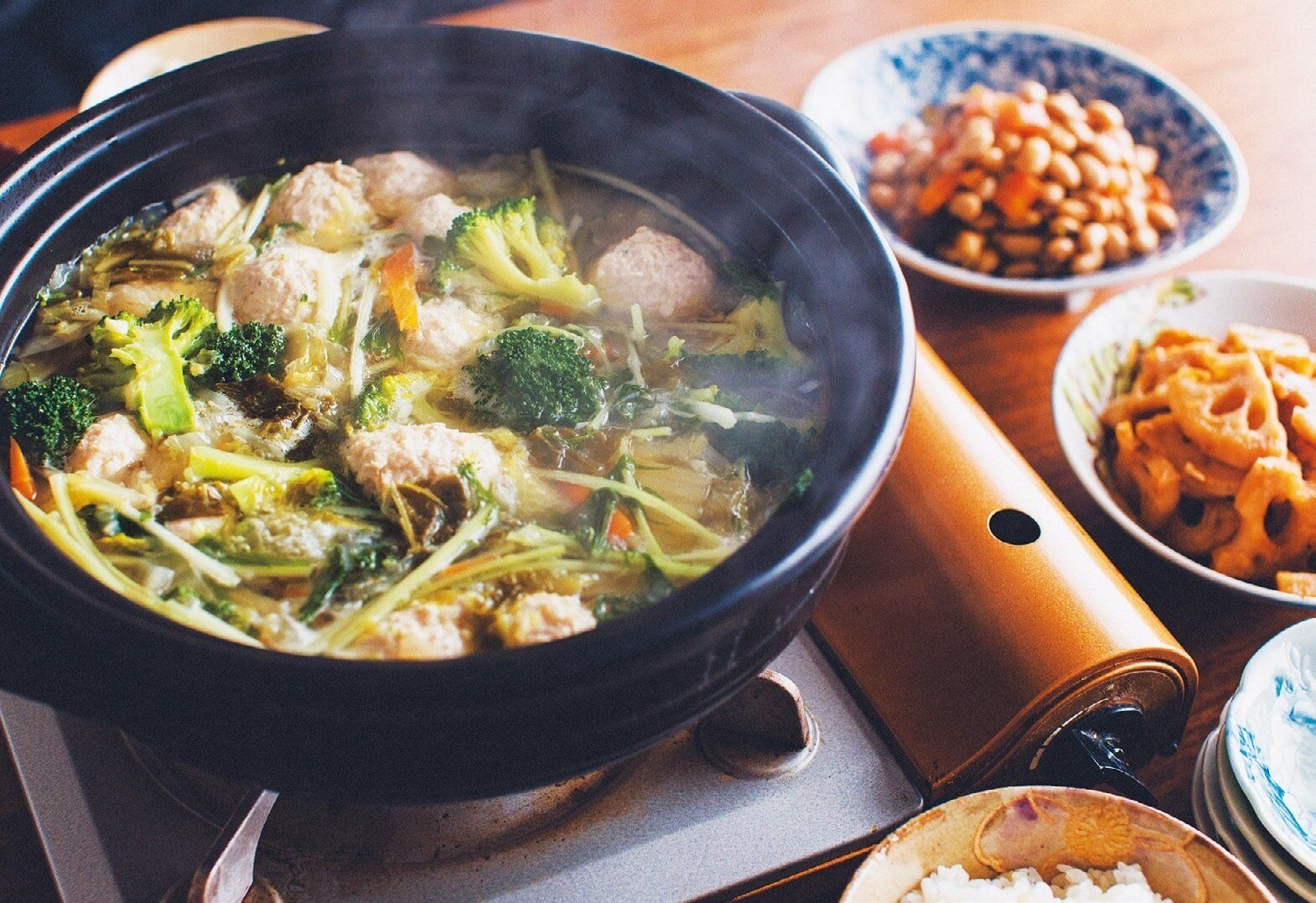 ●鶏だんご鍋 鶏ひき肉400g 白菜1/4株 ブロッコリー1/2個 にんじん1/2本 ねぎの白い部分1/2本分 水菜1/4袋