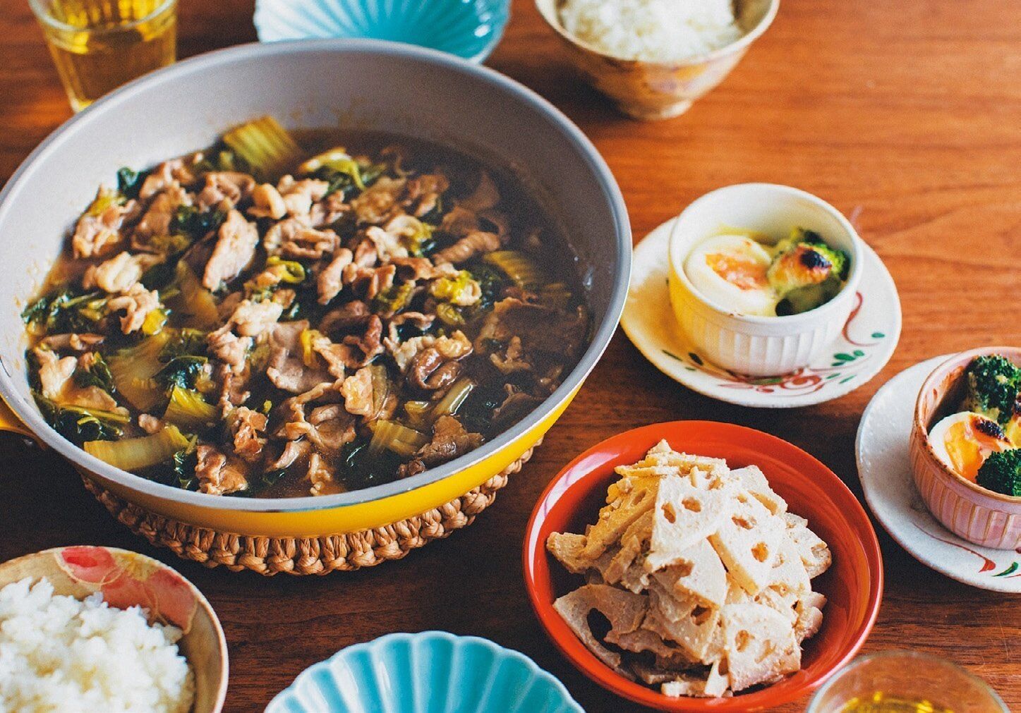 高校生と小学生の食べ盛り3人の子どもを育てる野口さんの食卓は、シンプルでセンス良くムダがないのが特徴です。なかでも目を見張るのが食材数の少なさ。「使う食材が少ないと、下ごしらえの手間も考える時間も減り、食材を使い切りやすいです」と野口さん。1つ買うと何度も使い回せる大型の白菜は、切り方や調理法を変え、同じ食材には見せません。食材数を絞れば、メインの肉をたっぷり買えるのも嬉しい点。野口さんの食卓は、少ない服をおしゃれに着こなすパリジェンヌの食卓版のようです。