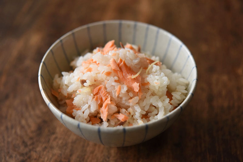 炊いたあとに鮭の身をほぐしてご飯に混ぜ込みます。