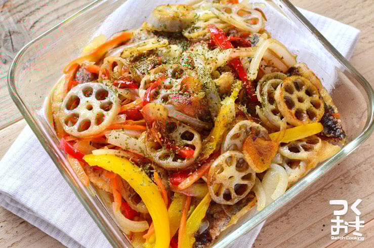 にんじん、玉ねぎ、ピーマンと鮭を甘酢に漬けるので作り置きにもぴったり!