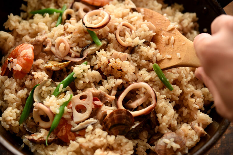 米3合に対して、いかを一匹(一ぱい)入れて炊き上げる昆布のうま味が広がる和風のパエリアレシピです。
