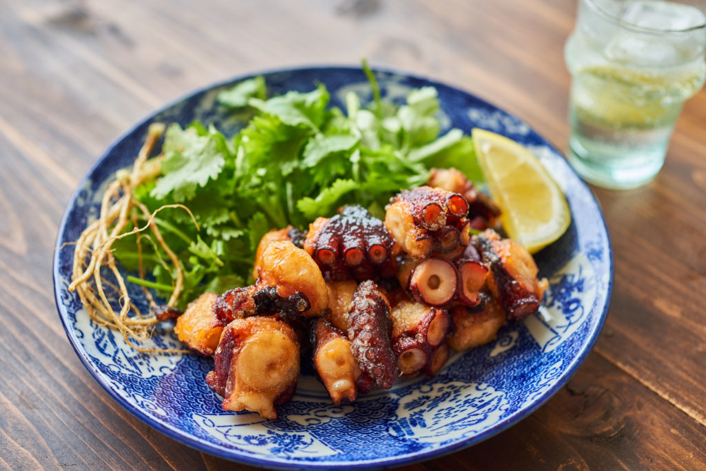 ゆでだこをしょうゆ、豆板醤、すりおろしにんにくに漬け、片栗粉をまぶして揚げてつくります。
