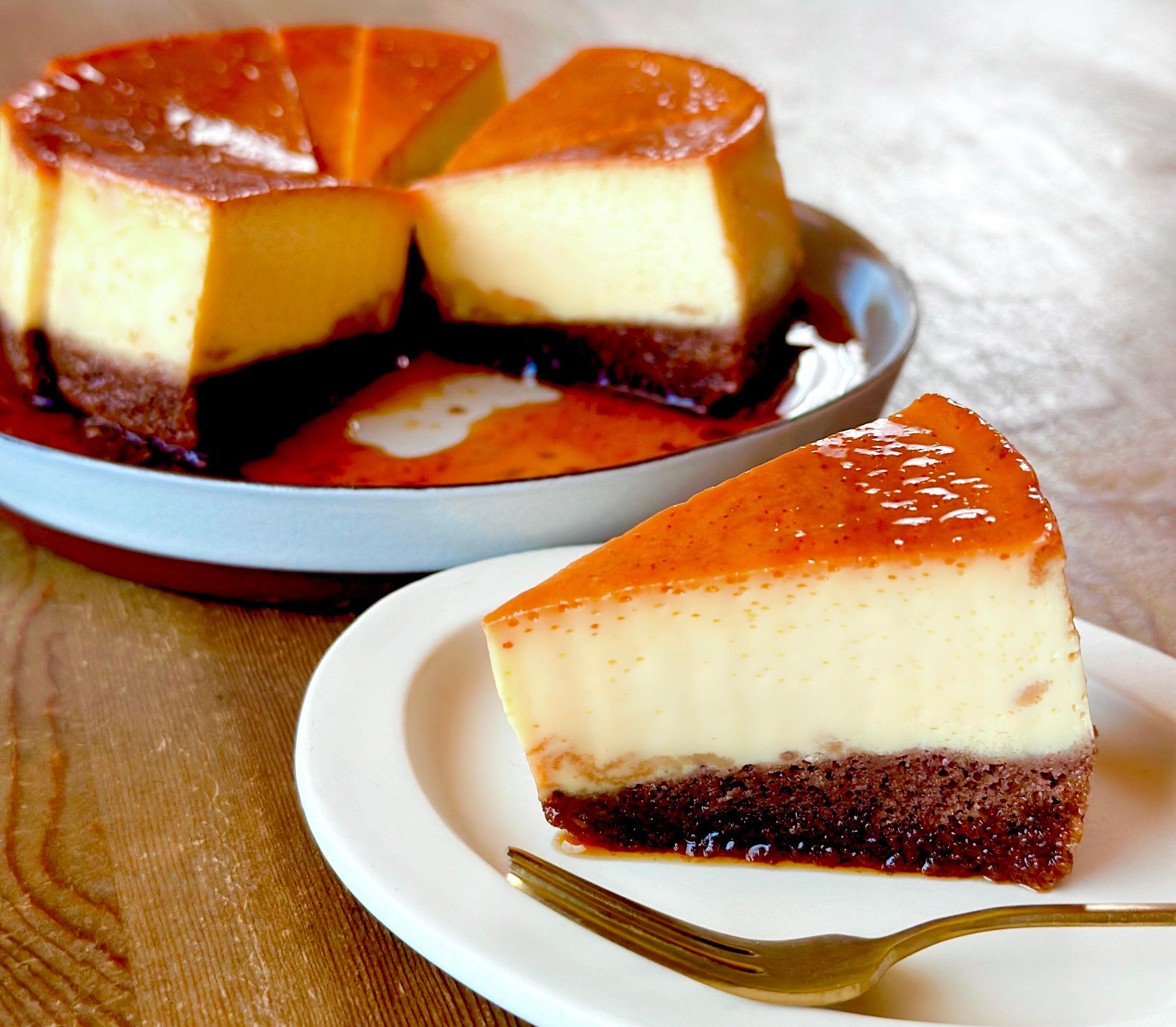 練乳を入れたむっちりと固いプリンと、カラメルを吸ったほろ苦いしっとりココアスポンジがたまらない禁断のスイーツです。