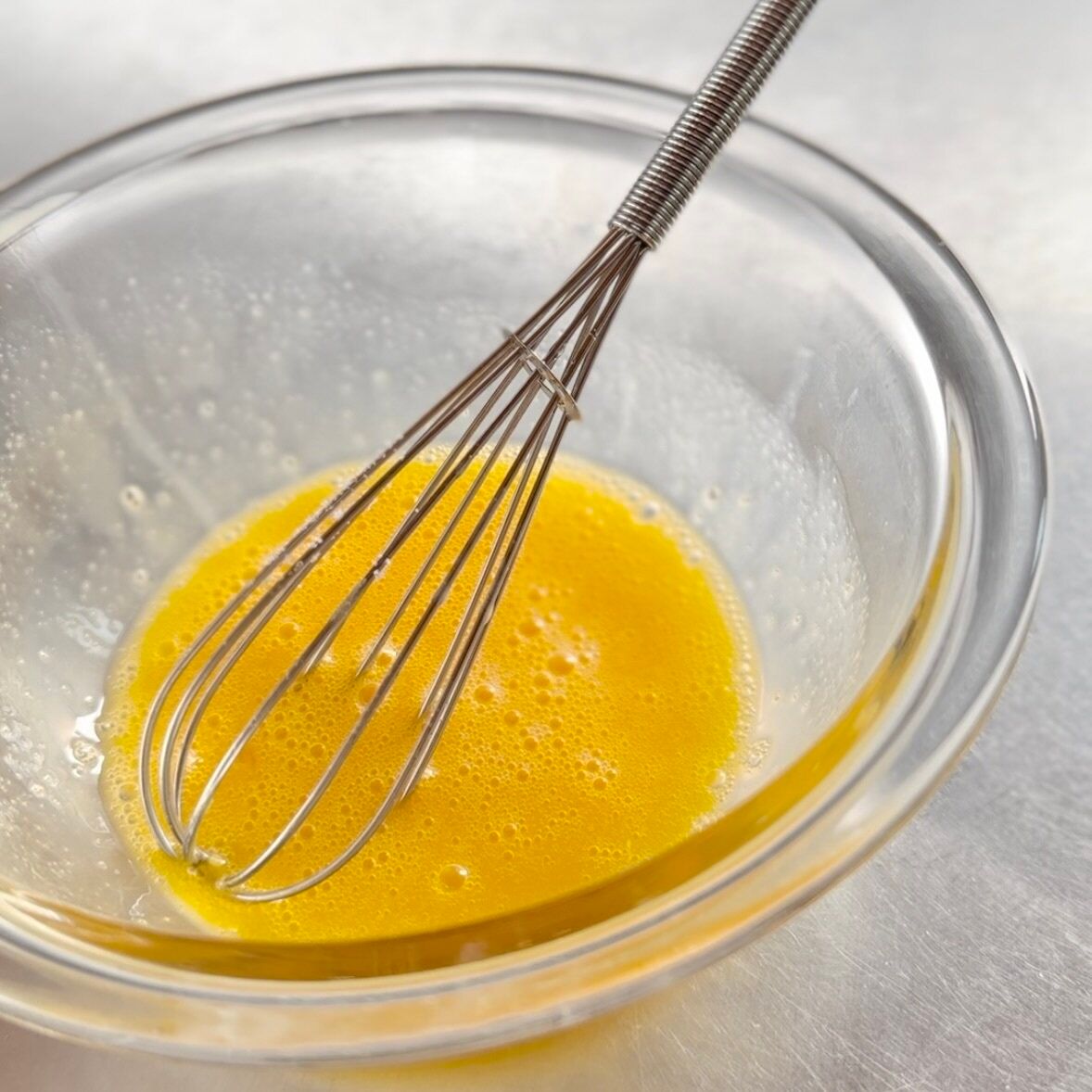 6.プリン生地で使ったボウルに卵1個を割り入れ、砂糖を加えてよく混ぜる。