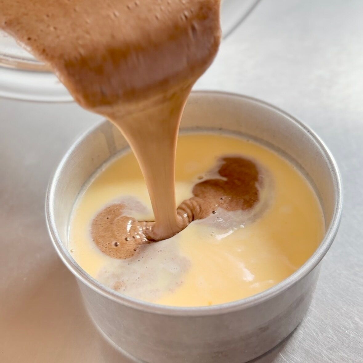 8.プリン液が入った5の型に7を静かに入れる。ココア生地は沈んでいきますが、焼いていると上に上がってくるので大丈夫です。